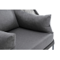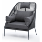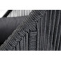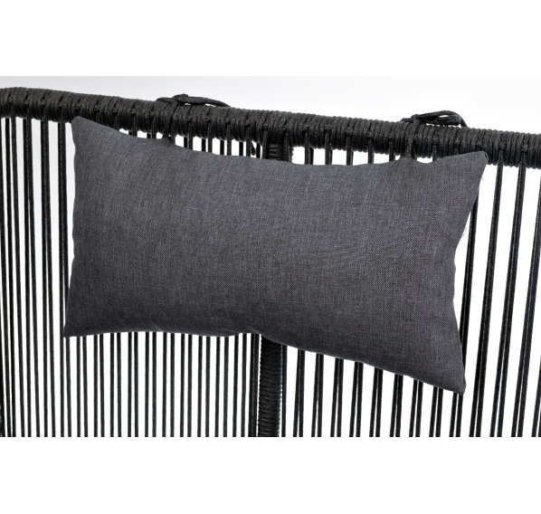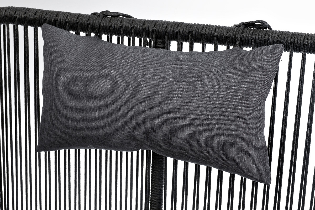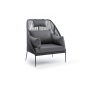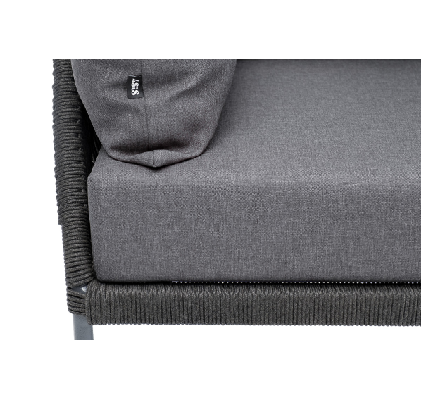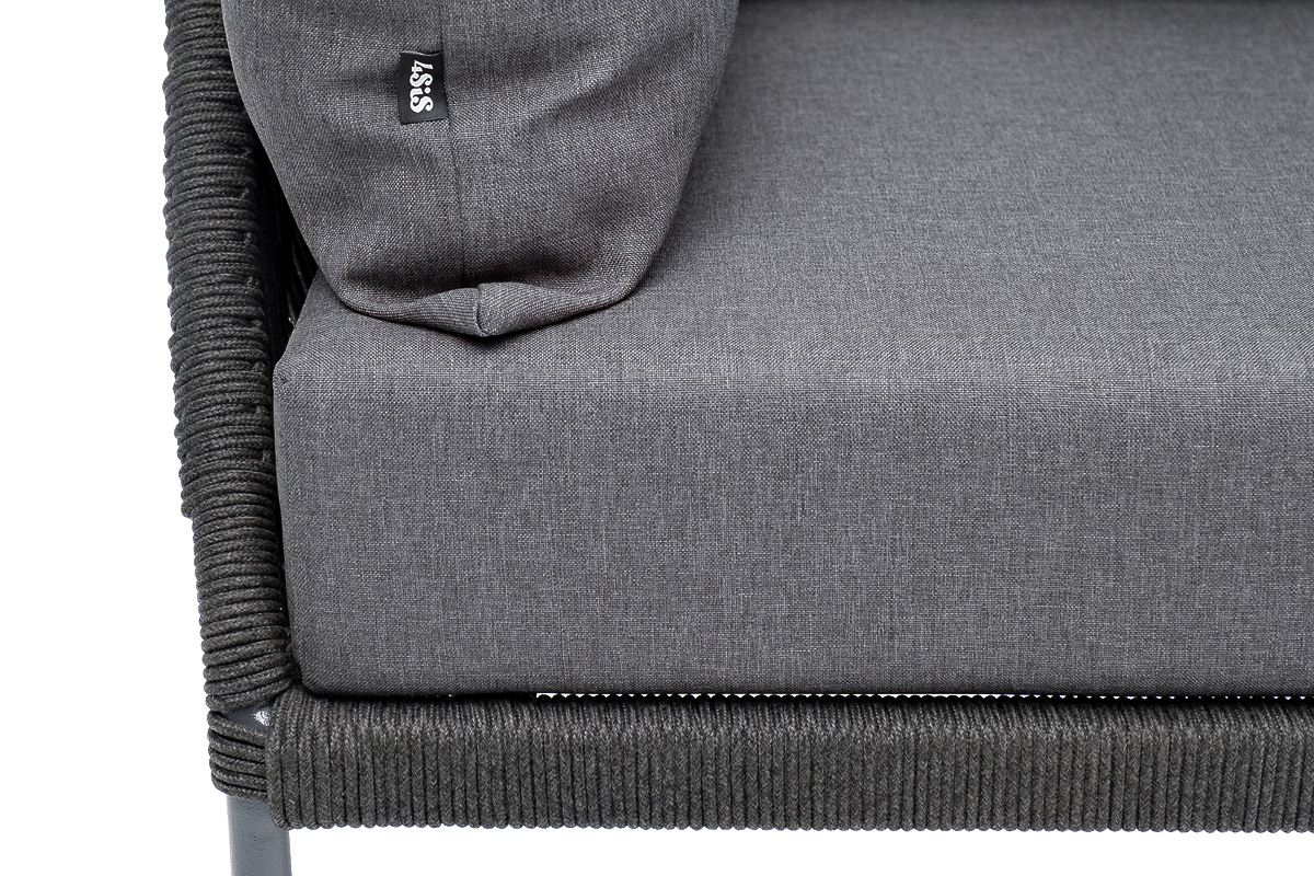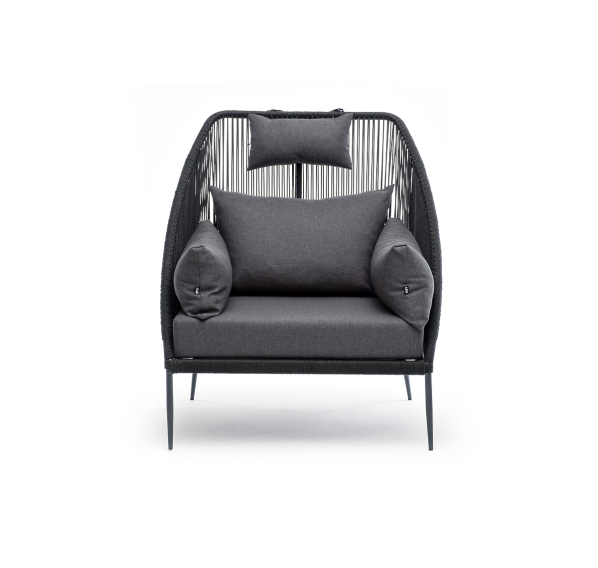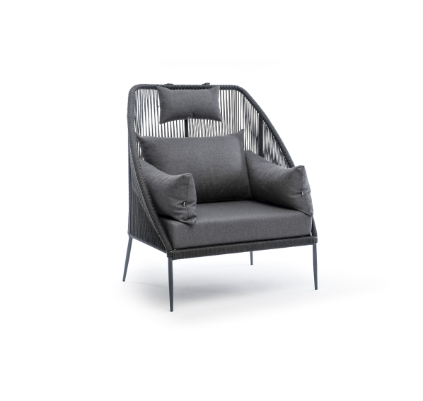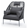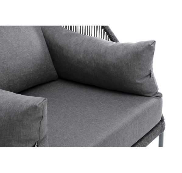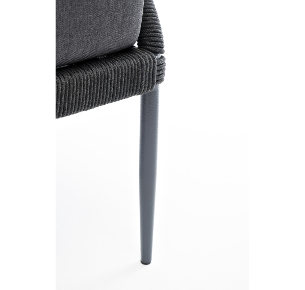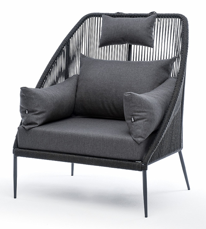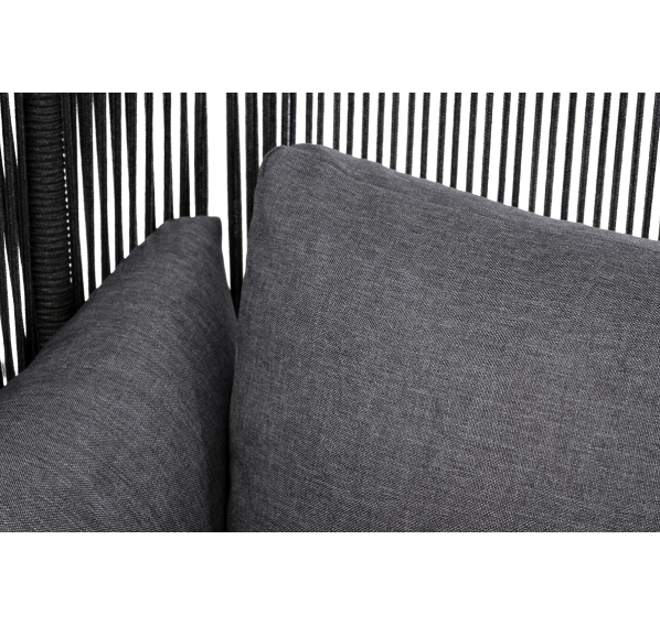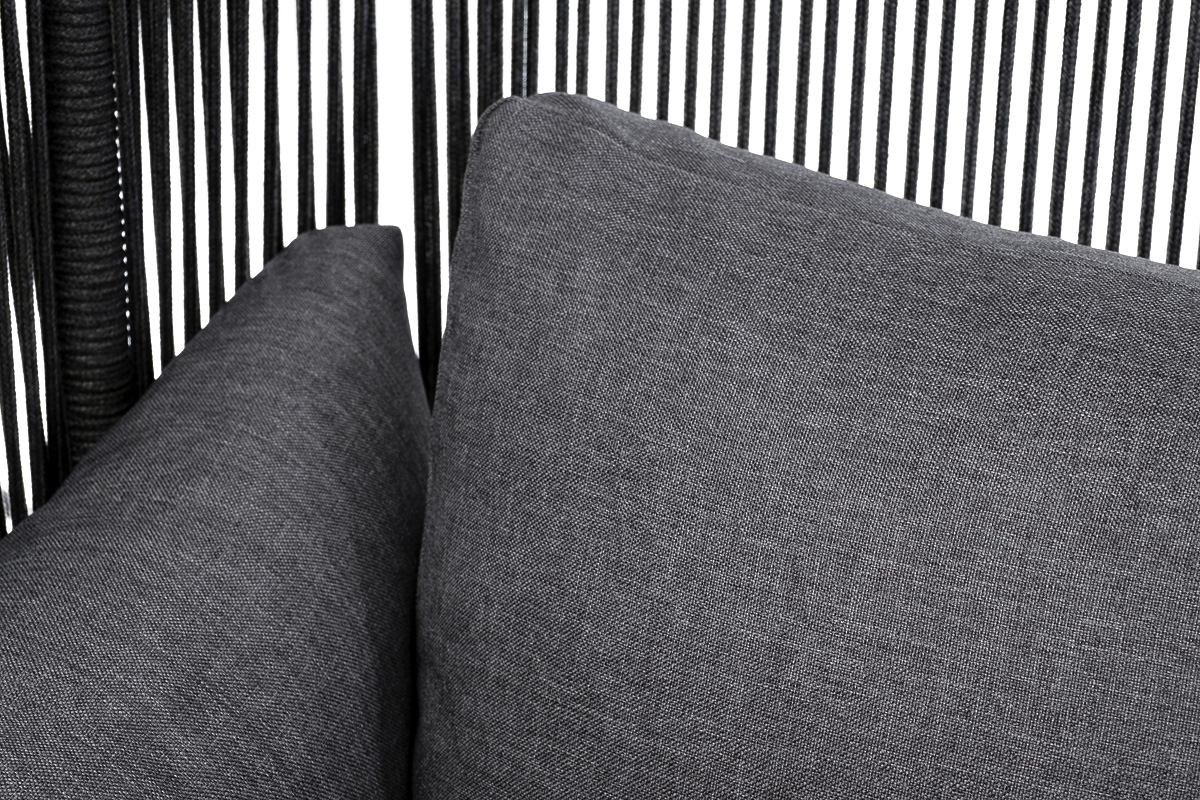 Кресло имеет алюминиевый каркас, окрашенный порошковой краской в темно-серый (RAL7024) цвет. Боковины каркаса вручную оплетены роупом - эластичными синтетическими лентами, изготовленными из высокопрочных полиэфирных волокон. Цвет оплетки - темно-серый.
