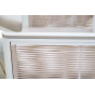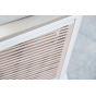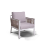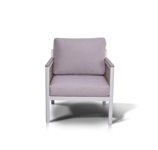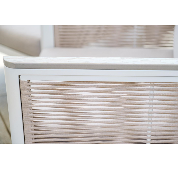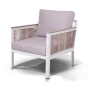 Размер модели – 680×780×700 мм. Ее каркас выполнен из высококачественного алюминия и окрашен порошковой краской в белый цвет. Боковые стороны подлокотников вручную оплетены эластичными синтетическими лентами серо-коричневого оттенка, состоящие из высокопрочных полиэфирных волокон.