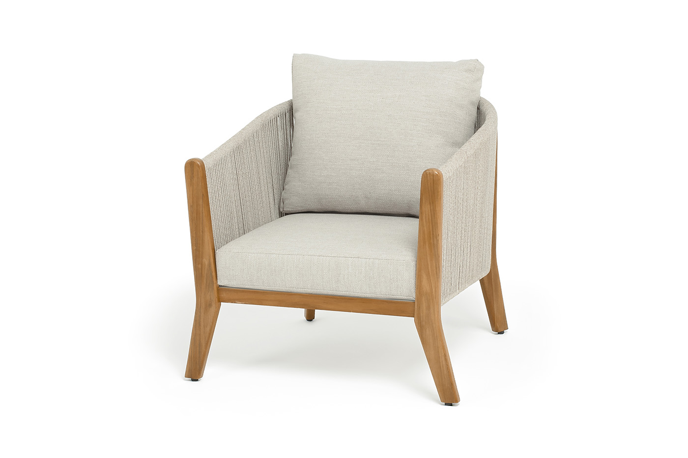 Основание кресла - тик, каркас из алюминия бежевого оттенка.