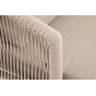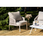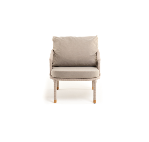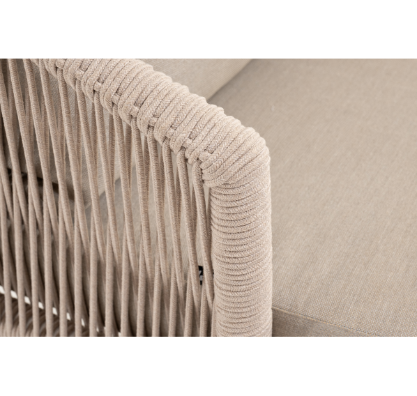 Кресло имеет алюминиевый каркас, окрашенный порошковой краской в белый цвет. Боковины каркаса вручную оплетены роупом - эластичными синтетическими лентами, изготовленными из высокопрочных полиэфирных волокон. Цвет оплетки - бежевый. На ножках кресла идут дубовые наконечники (заглушки).