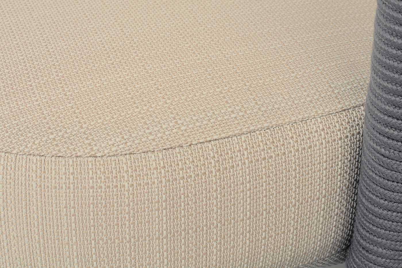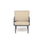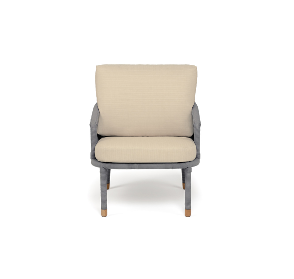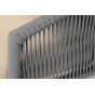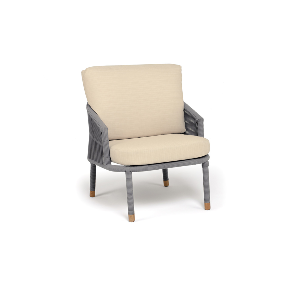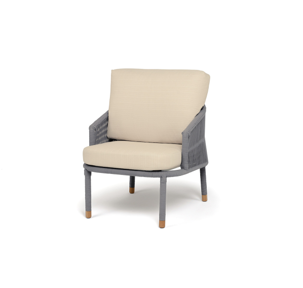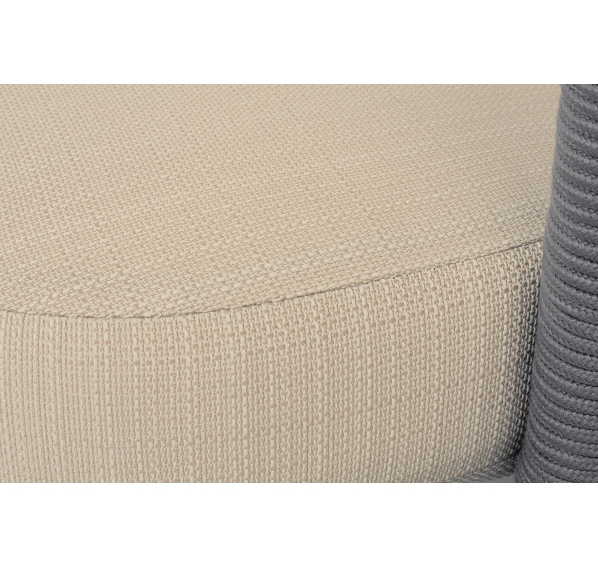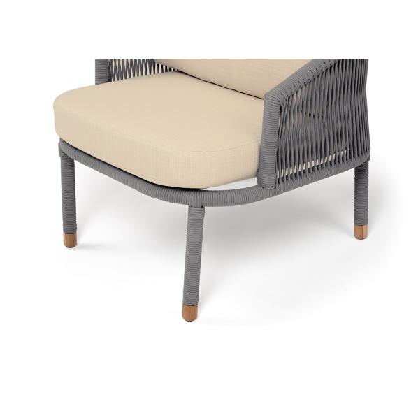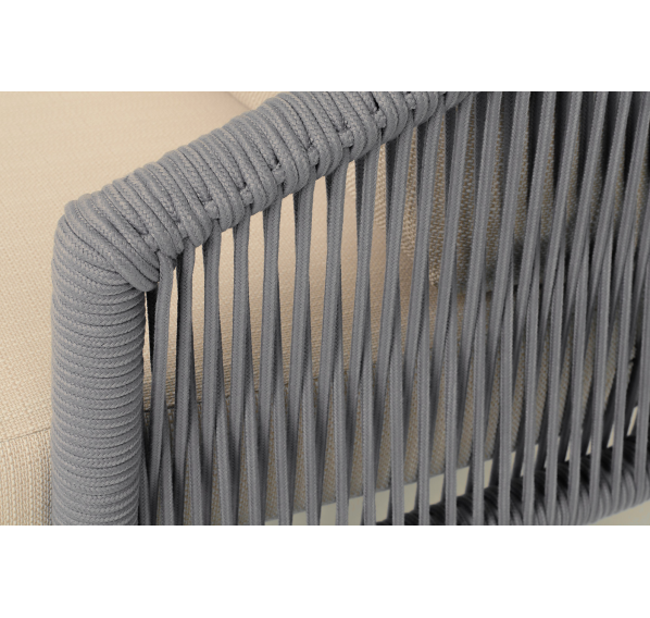 Кресло имеет алюминиевый каркас, окрашенный порошковой краской в светло-серый (RAL7035) цвет. Боковины каркаса вручную оплетены роупом - эластичными синтетическими лентами, изготовленными из высокопрочных полиэфирных волокон. Цвет оплетки - светло-серый. На ножках кресла идут дубовые наконечники (заглушки).