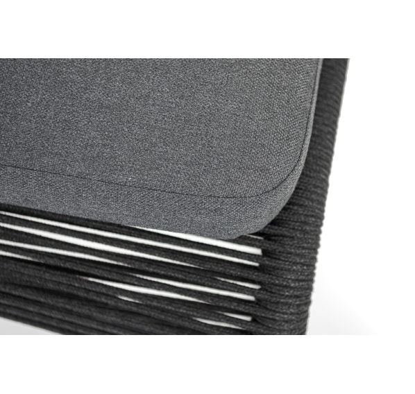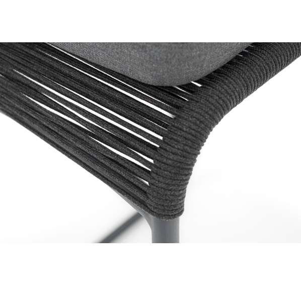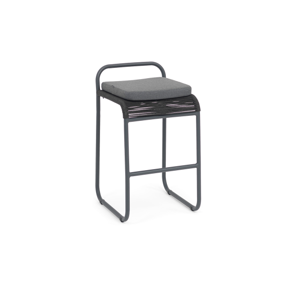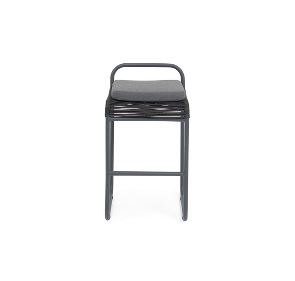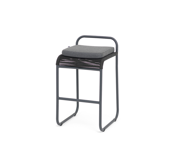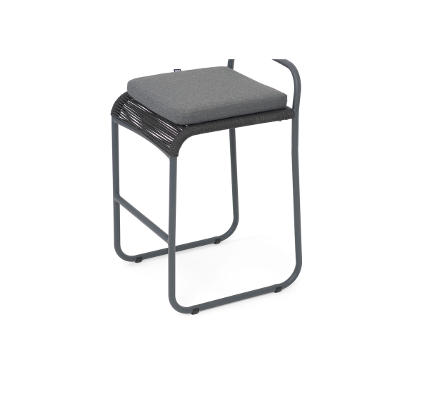Барный стул «Ането» представлен в алюминиевом каркасе темно-серого (RAL7024) цвета. Оплетен вручную эластичными синтетическими лентами из высокопрочных полиэфирных волокон темно-серого цвета.