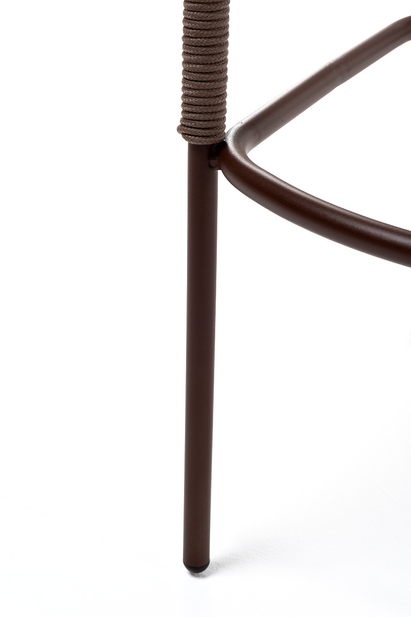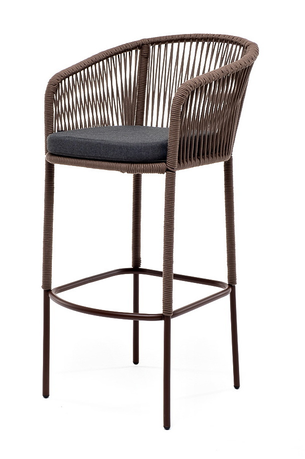 Барный стул «Марсель» представлен в стальном каркасе коричневого (RAL8016) цвета, оплетен вручную эластичными синтетическими лентами из высокопрочных полиэфирных волокон, коричневого оттенка, размер стула: 590×510×1070 мм.