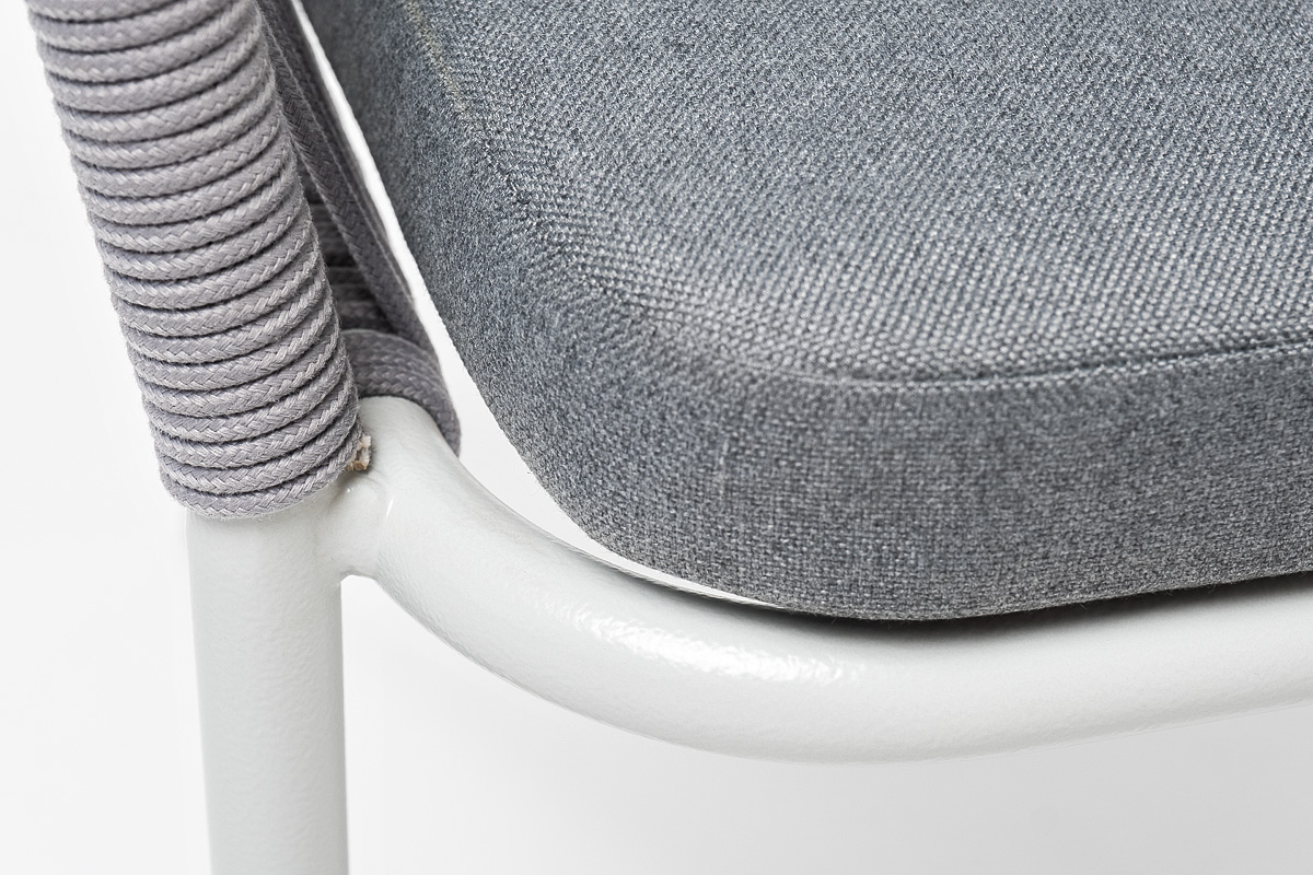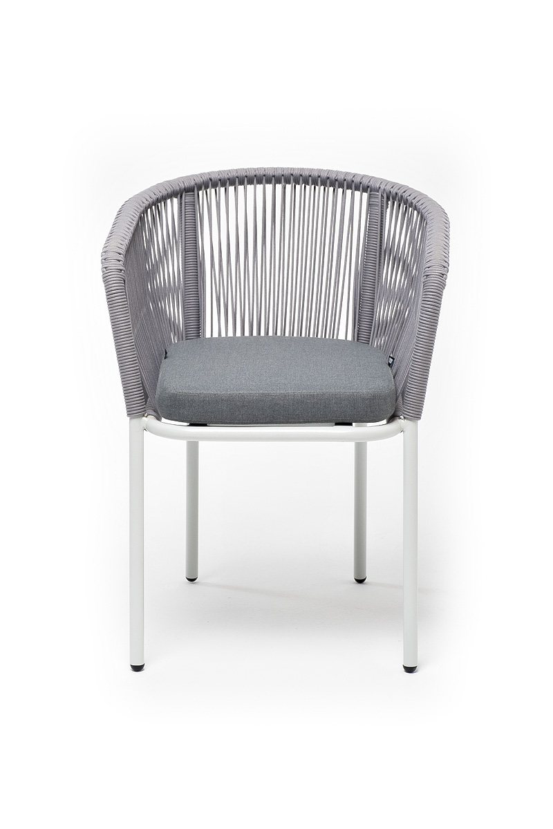 Плетеный стул из коллекции «Марсель» представлен в светлых тонах. Каркас из прочного алюминия окрашен порошковой краской в белый цвет, ручная оплетка - роуп светло-серого оттенка.