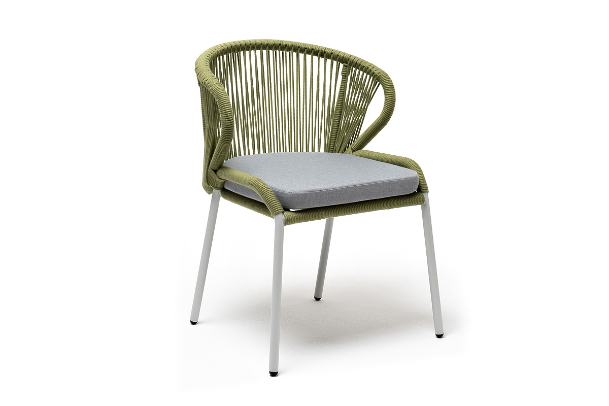 Изготовлен из алюминиевого каркаса, оплетенного вручную эластичными синтетическими лентами из высокопрочных полиэфирных волокон (роуп круглый). Цвет каркаса - светло-серый (RAL7035), оплетки - салатовый меланж.