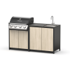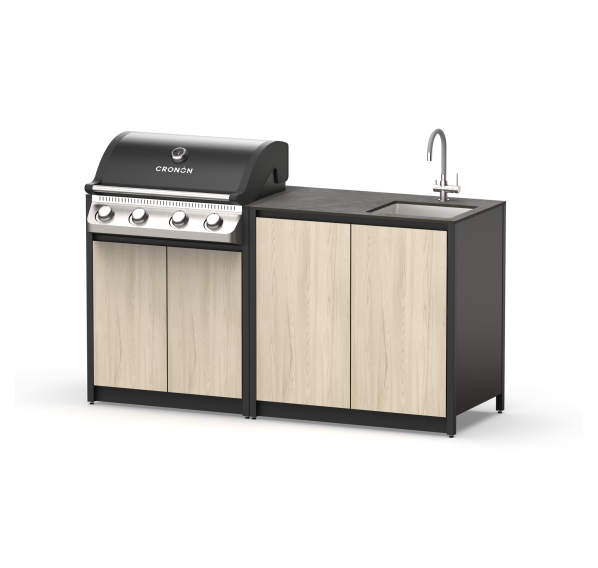 Уличный барбекю комплекс из двух модулей закрытого типа с газовым грилем, столешницей и мойкой.