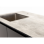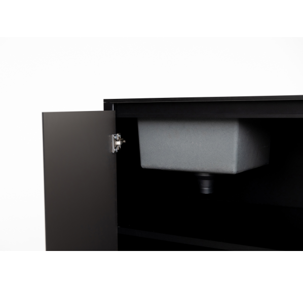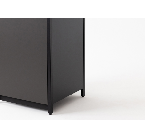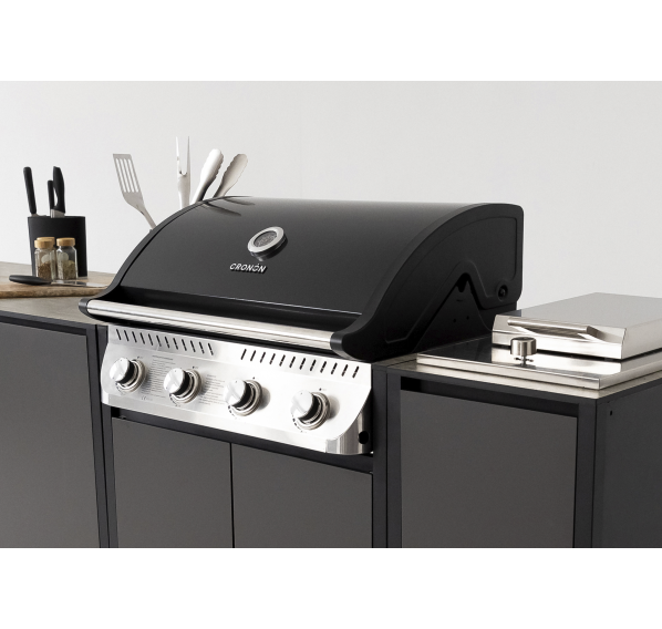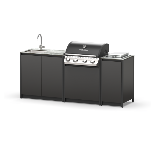 Барбекю комплекс из металла закрытого типа из трех модулей с мойкой, газовым грилем и газовой плитой.
