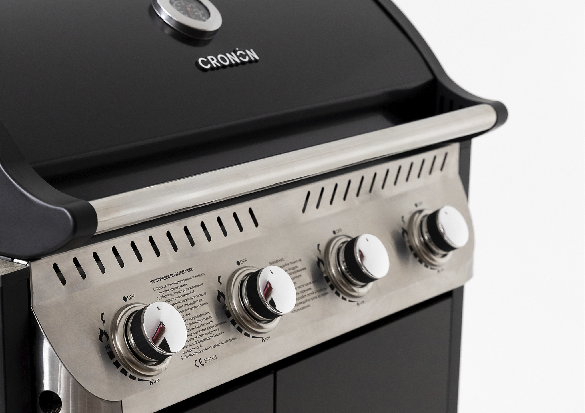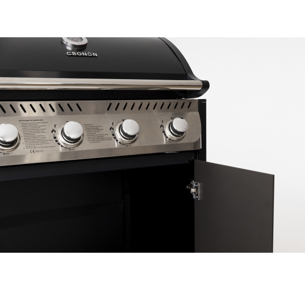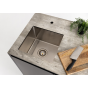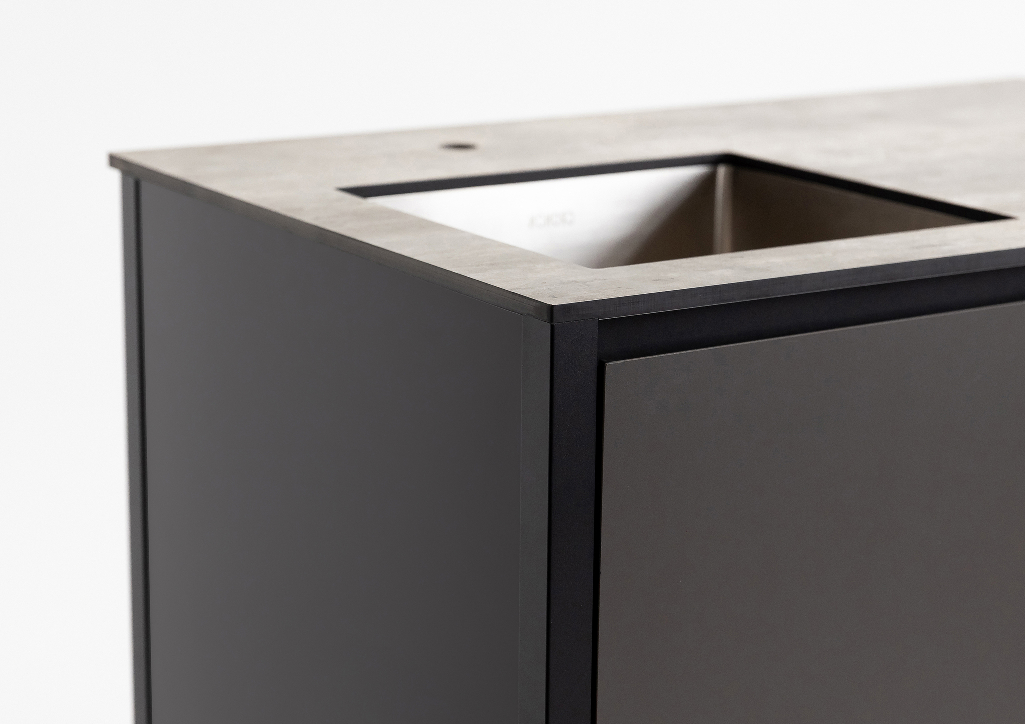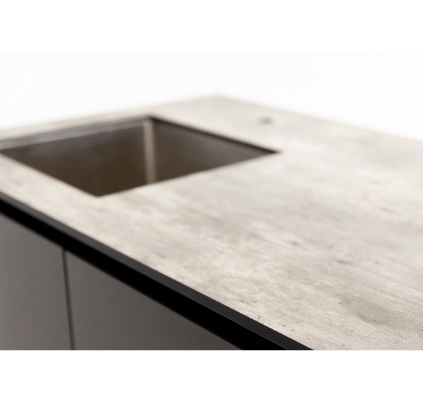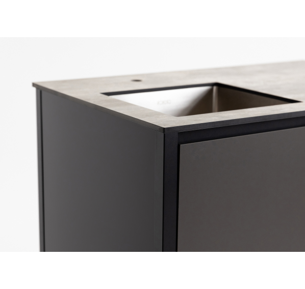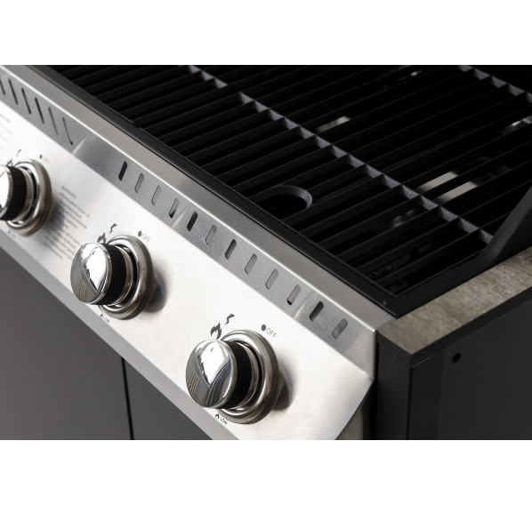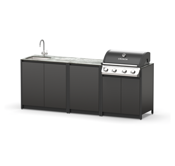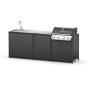 Барбекю комплекс в стиле лофт закрытого типа из трех модулей с газовым грилем, дверцами, мойкой и столешницей.