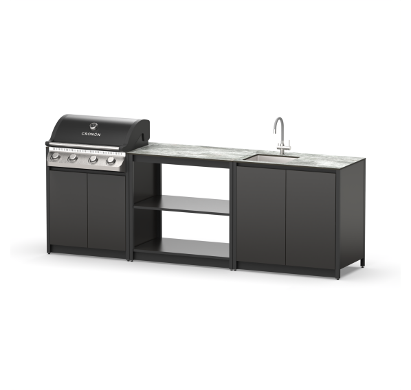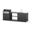 Сборный барбекю комплекс из трех модулей смешанного типа с мойкой, газовым грилем, столешницей и полками.