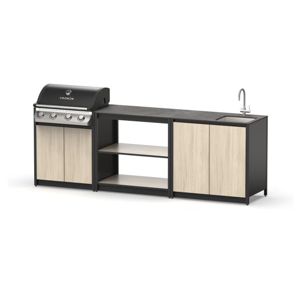 Сборный барбекю комплекс из трех модулей смешанного типа с мойкой, газовым грилем, столешницей и полками.