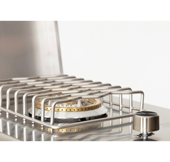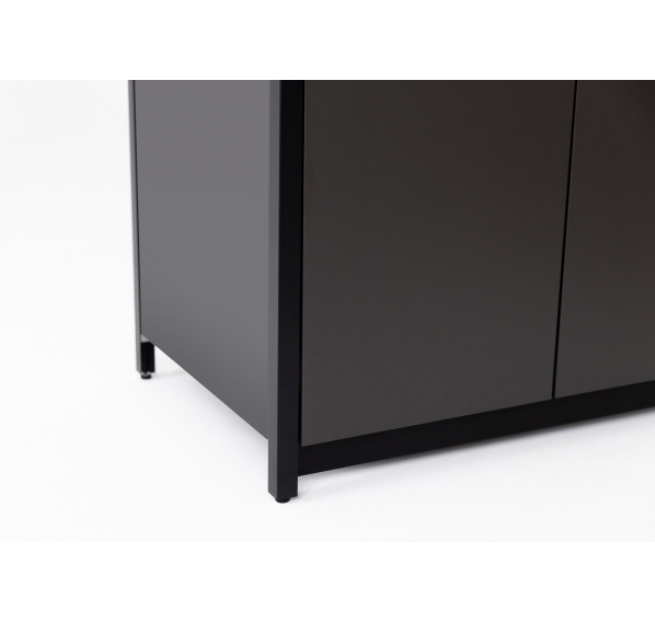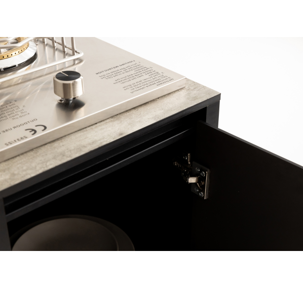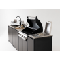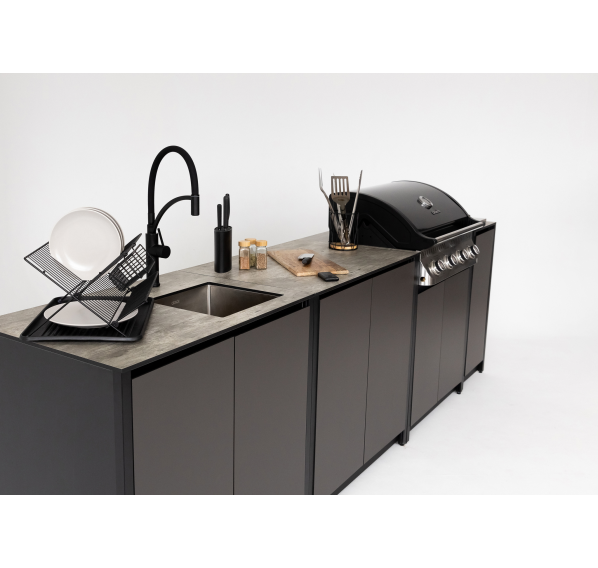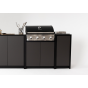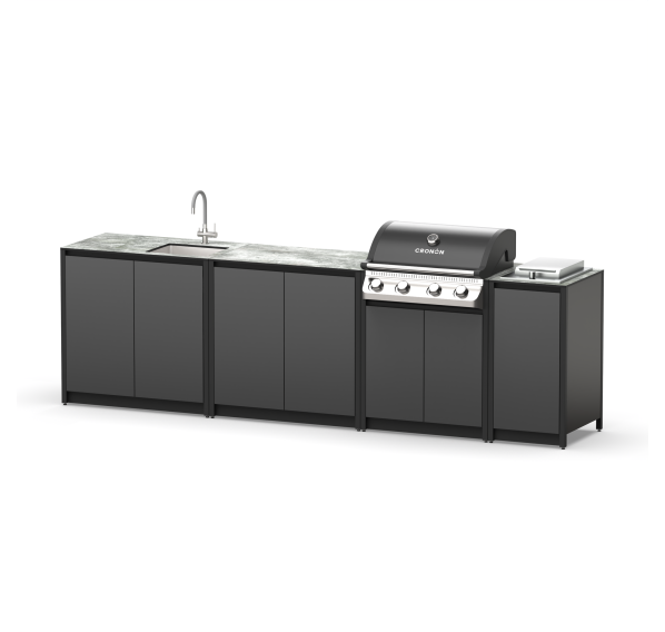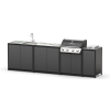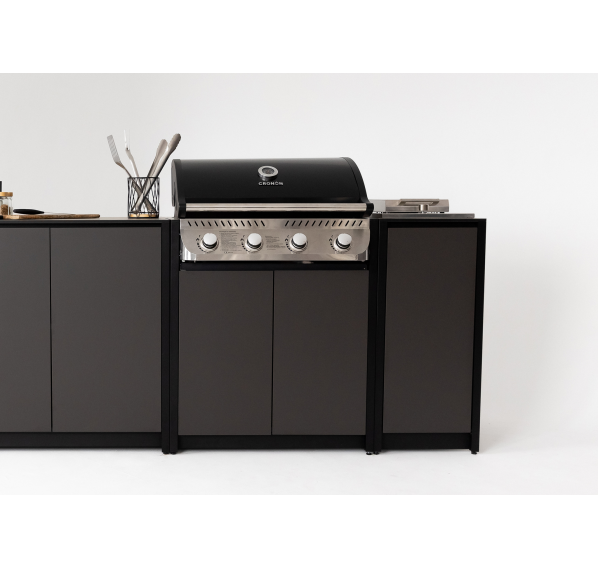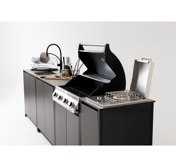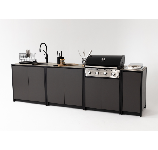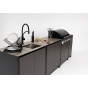 Модульный барбекю комплекс из четырех модулей закрытого типа со столешницей, мойкой, газовым грилем и плитой.