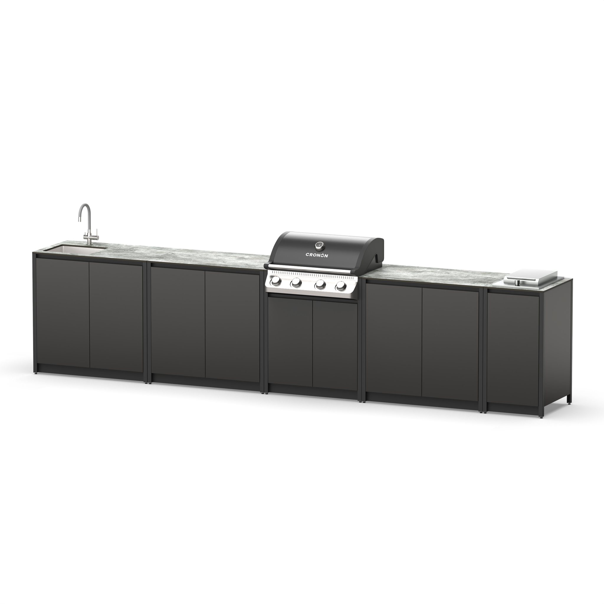 Модульный барбекю комплекс из металла закрытого типа из пяти модулей с газовым грилем, мойкой, столешницей и газовой плитой.