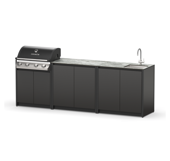 Летняя кухня из металла закрытого типа из трех модулей со столешницей, мойкой, полками и газовым грилем для дома и дачи.