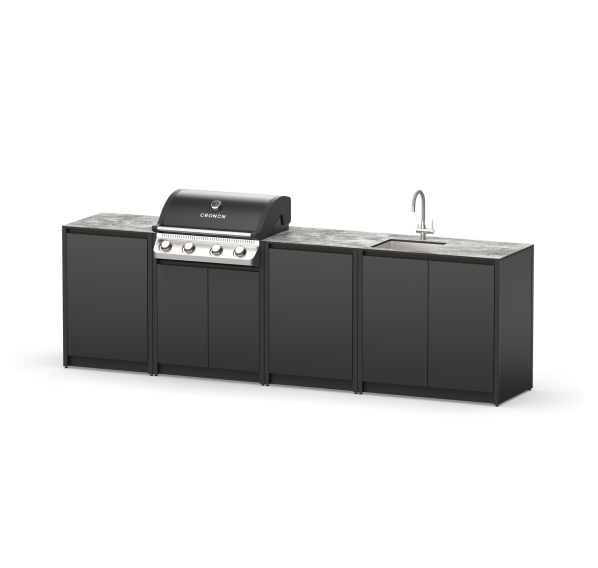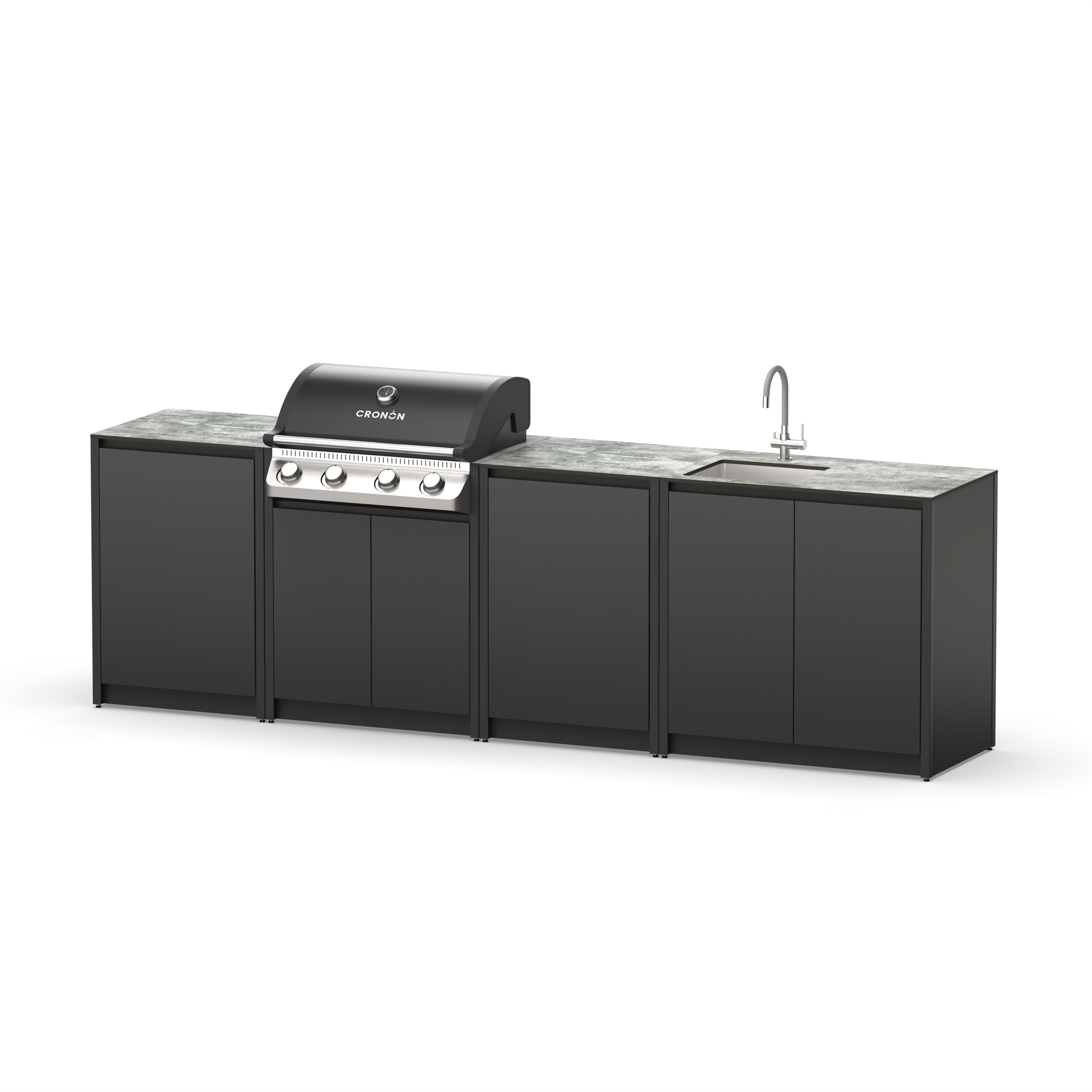 Металлическая гриль кухня закрытого типа из четырех модулей с газовым грилем, мойкой, столешницей и дверцами для дома.