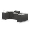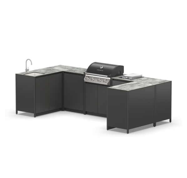Барбекю зона из металла и семи модулей закрытого типа с газовым грилем, мойкой, дверками и газовой плитой.