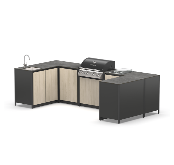 Барбекю зона из металла из семи модулей закрытого типа с газовым грилем, мойкой, дверками и газовой плитой.
