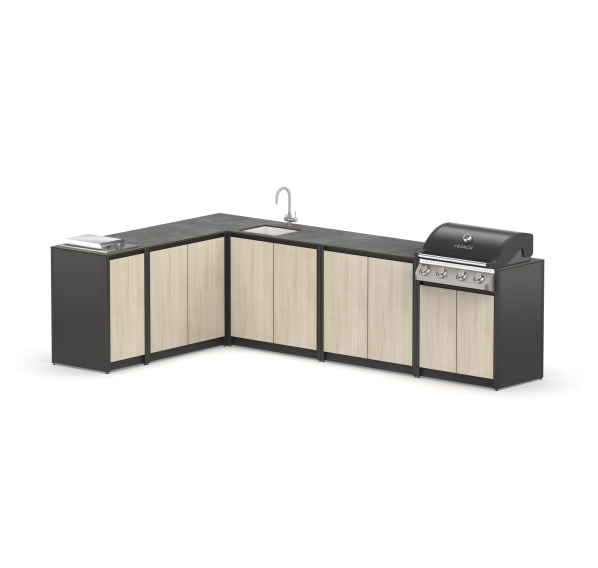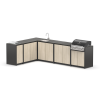 Угловая современная гриль кухня из шести модулей закрытого типа с газовым грилем, мойкой, столешницей и газовой плитой для дачи.