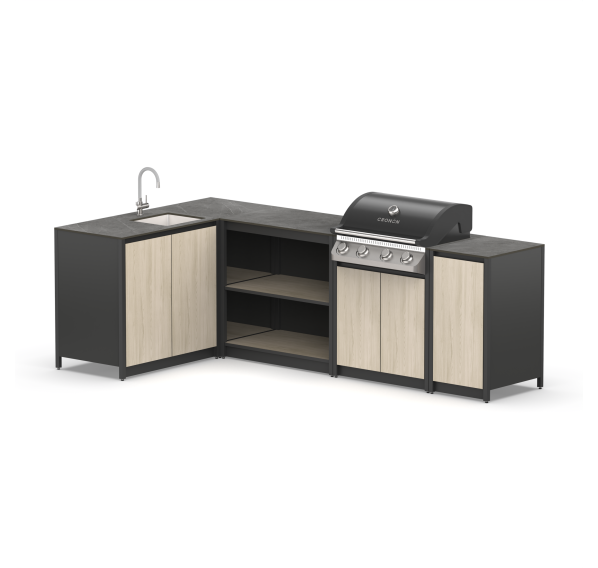 Угловой гриль комплекс из пяти модулей смешанного типа с газовым грилем, мойкой, столешницей и дверцами.