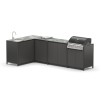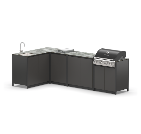 Угловая барбекю зона закрытого типа из пяти модулей с газовым грилем, мойкой, столешницей и газовой плитой.