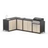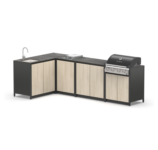 Угловая барбекю зона закрытого типа из пяти модулей с газовым грилем, мойкой, столешницей и газовой плитой.