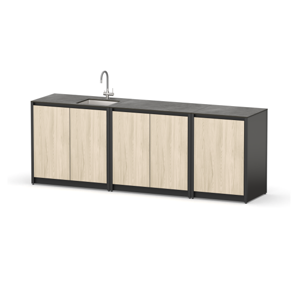 Уличная стальная кухня закрытого типа из трех модулей с дверцами, мойкой, столешницей и полками для дома и дачи.