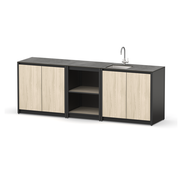 Летняя металлическая кухня из трех модулей смешанного типа с мойкой, дверцами, столешницей и полками для дачи и дома.
