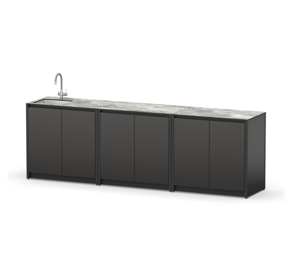 Садовая кухня из металла из трех модулей с мойкой, полками и столешницей для дачи и загородного дома.