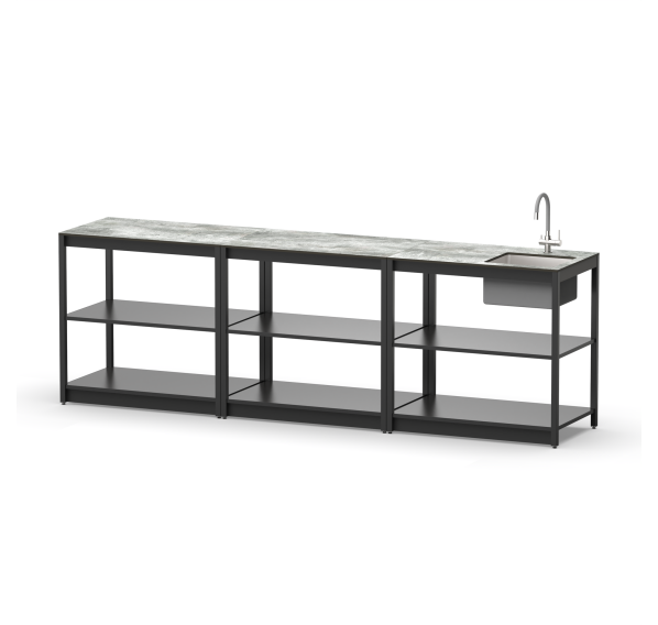 Уличная кухня из трех модулей открытого типа с мойкой, столешницей и полками для дачи и дома.