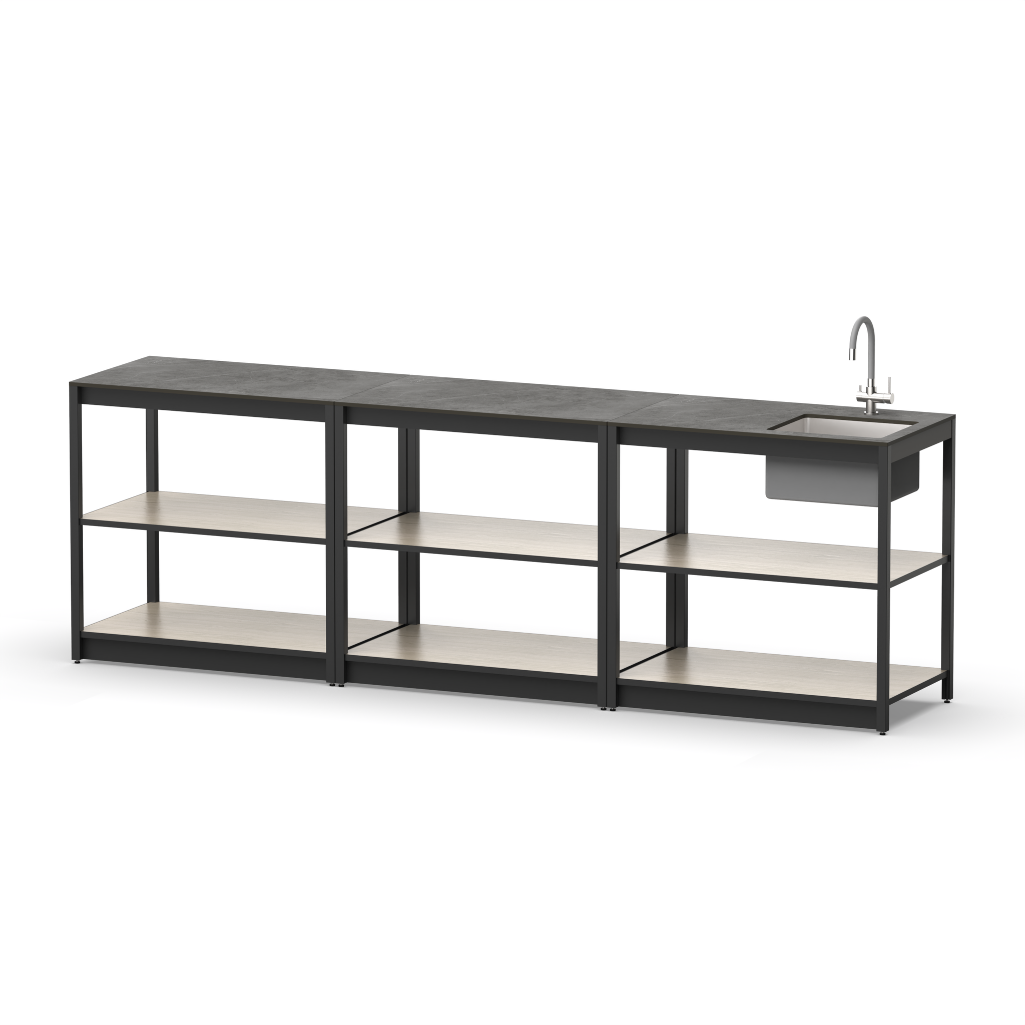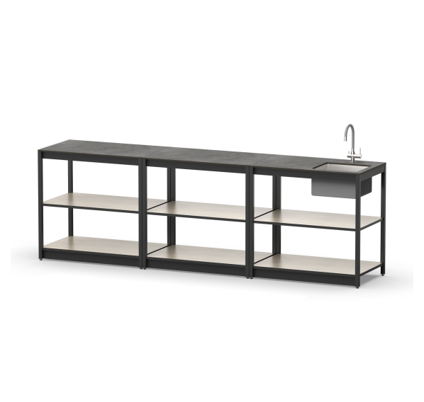 Уличная кухня из трех модулей открытого типа с мойкой, столешницей и полками для дачи и дома.