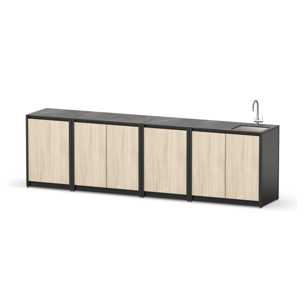 Уличная кухня из четырех модулей закрытого типа со столешницей, мойкой и полками для дачи.