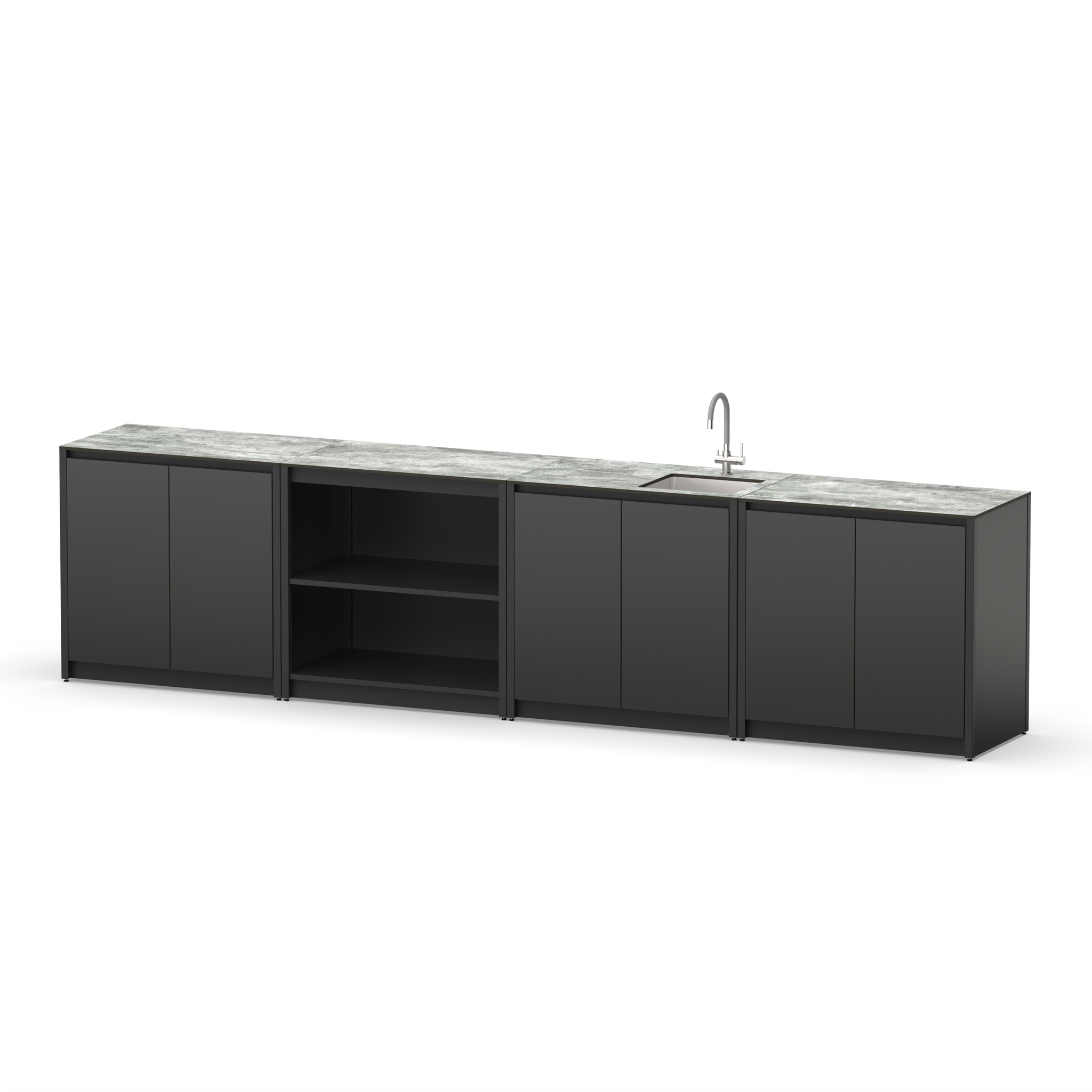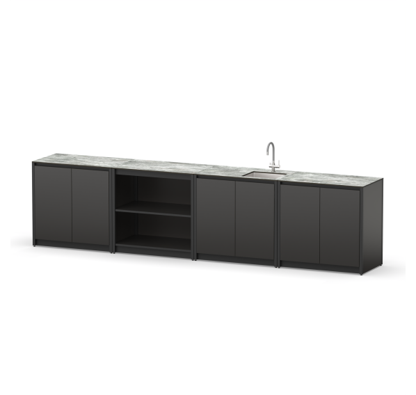 Уличная металлическая кухня из четырех модулей со столешницей, дверцами, мойкой и полками для дачи и дома.