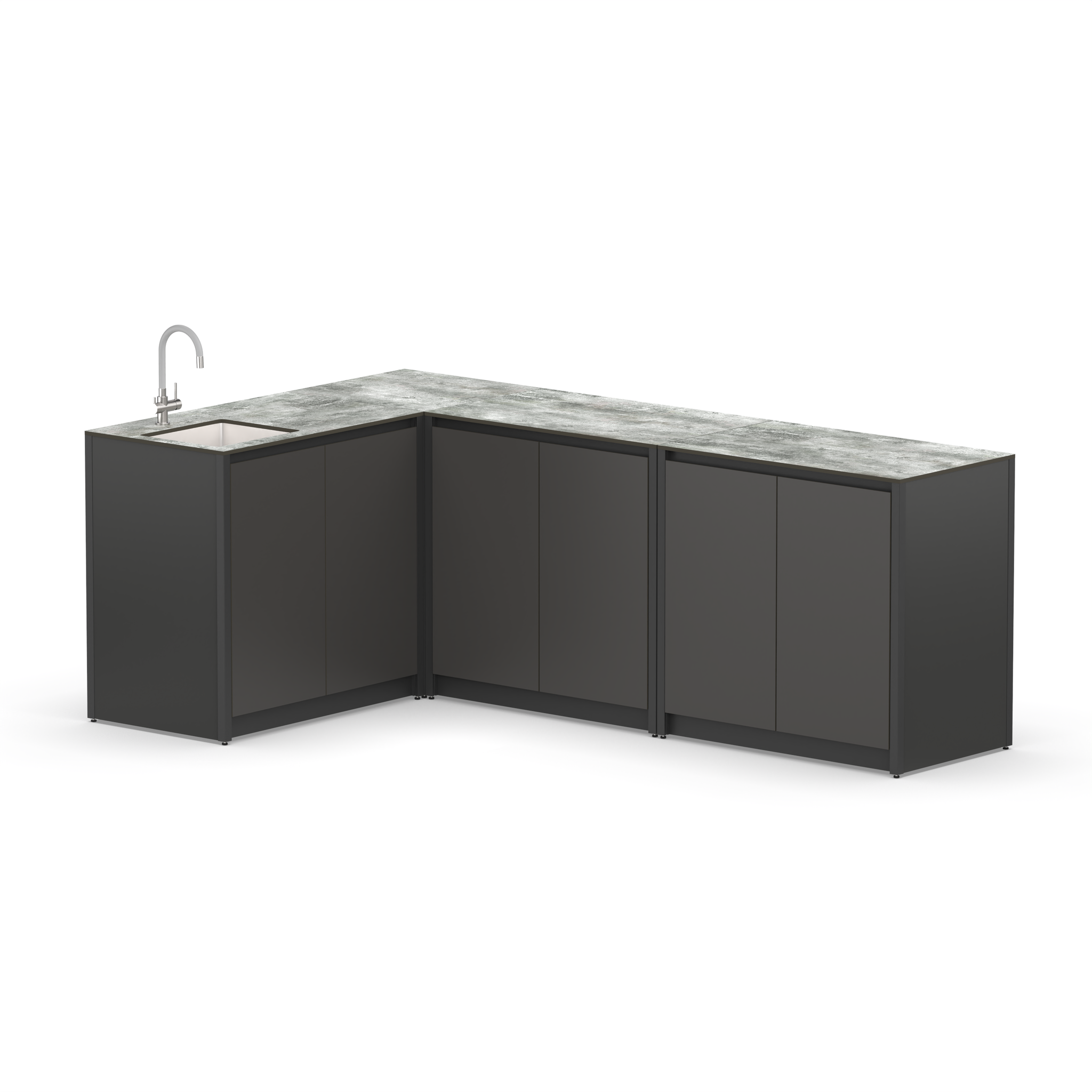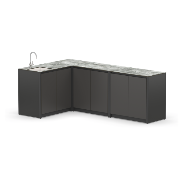 Угловая металлическая кухня закрытого типа из четырех модулей с мойкой, столешницей, дверцами и полками для дома и дачи.