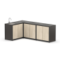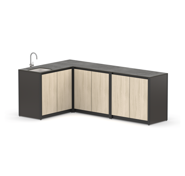 Угловая металлическая кухня закрытого типа из четырех модулей с мойкой, столешницей, дверцами и полками для дома и дачи.