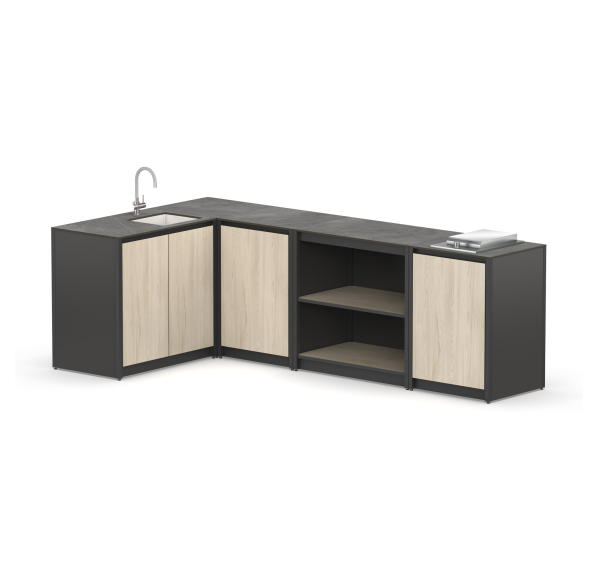 Угловая кухня из металла смешанного типа из пяти модулей с газовой плитой, мойкой, столешницей и полками для улицы и дачи.
