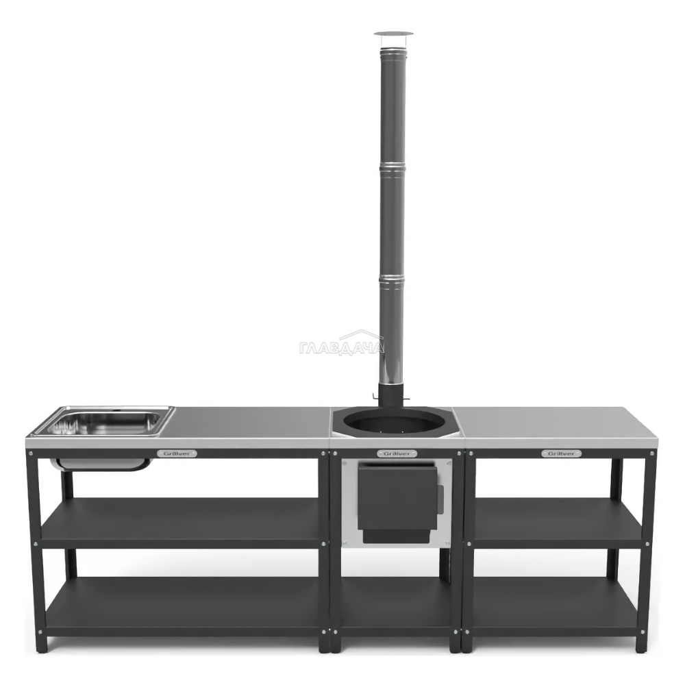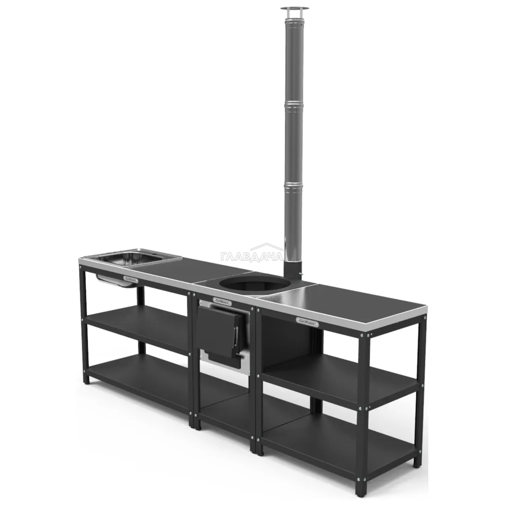 стол, печь, дымоход, разделочный стол - 2 шт., мойка, выпуск, сифон, крепёж