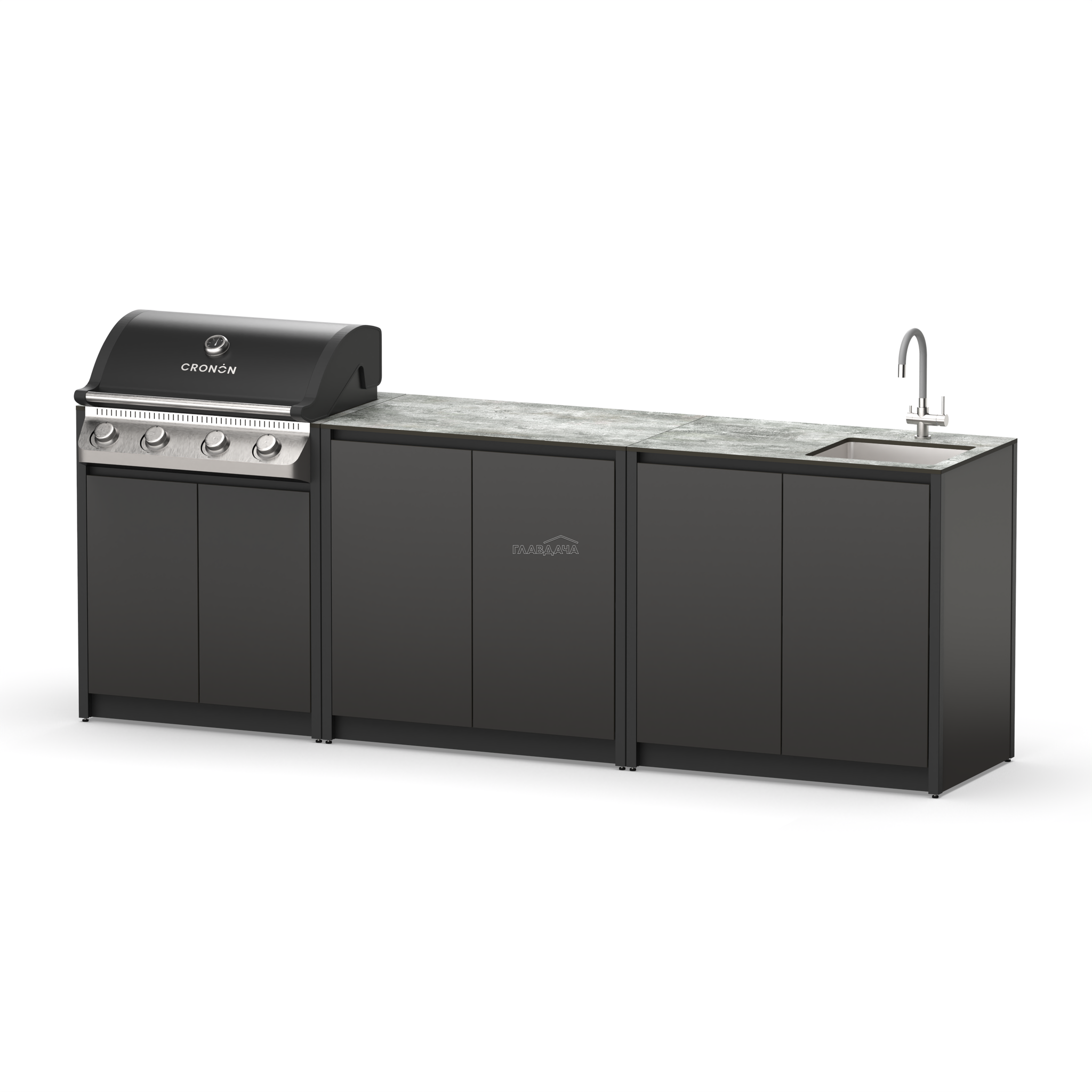 Гарнитур уличной кухни Cronon Lounge — идеальное решение для комфортного отдыха на свежем воздухе! Благодаря водонепроницаемым материалам (HPL-каркасу и столешнице) выдерживает любые погодные условия. Регулируемые ножки обеспечивают устойчивость даже на неровных поверхностях. Встроенная мойка из нержавеющей стали упрощает процесс готовки и уборки. Идеально дополнит территорию дачи или загородного дома.