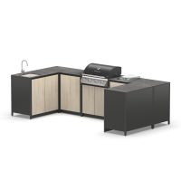 Угловая современная гриль кухня из шести модулей закрытого типа с газовым грилем, мойкой, столешницей и газовой плитой для дачи.