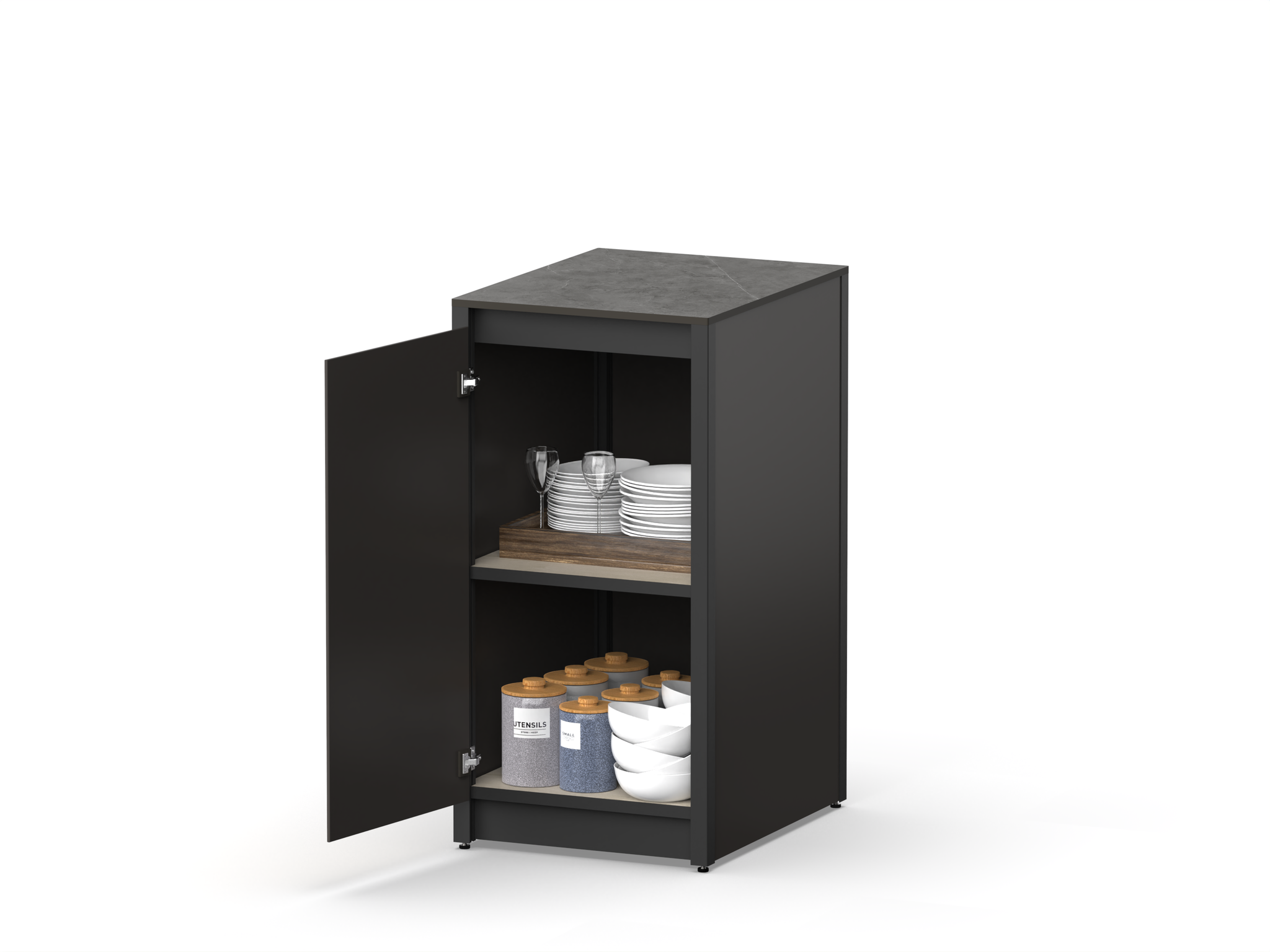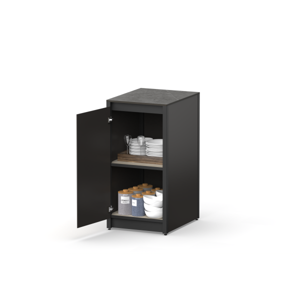 Удобная открывающаяся дверца делают хранение посуды легким и удобным. Алюминиевый каркас обеспечивает надежность, а черный цвет придает шкафу элегантный вид. Этот функциональный элемент уличной мебели безупречно впишется в любое помещение, добавляя изысканности вашему загородному дому.