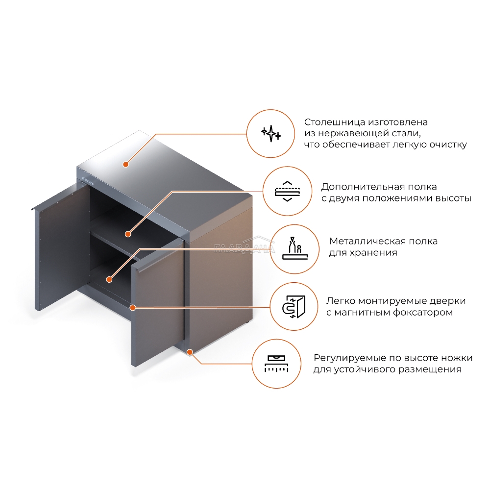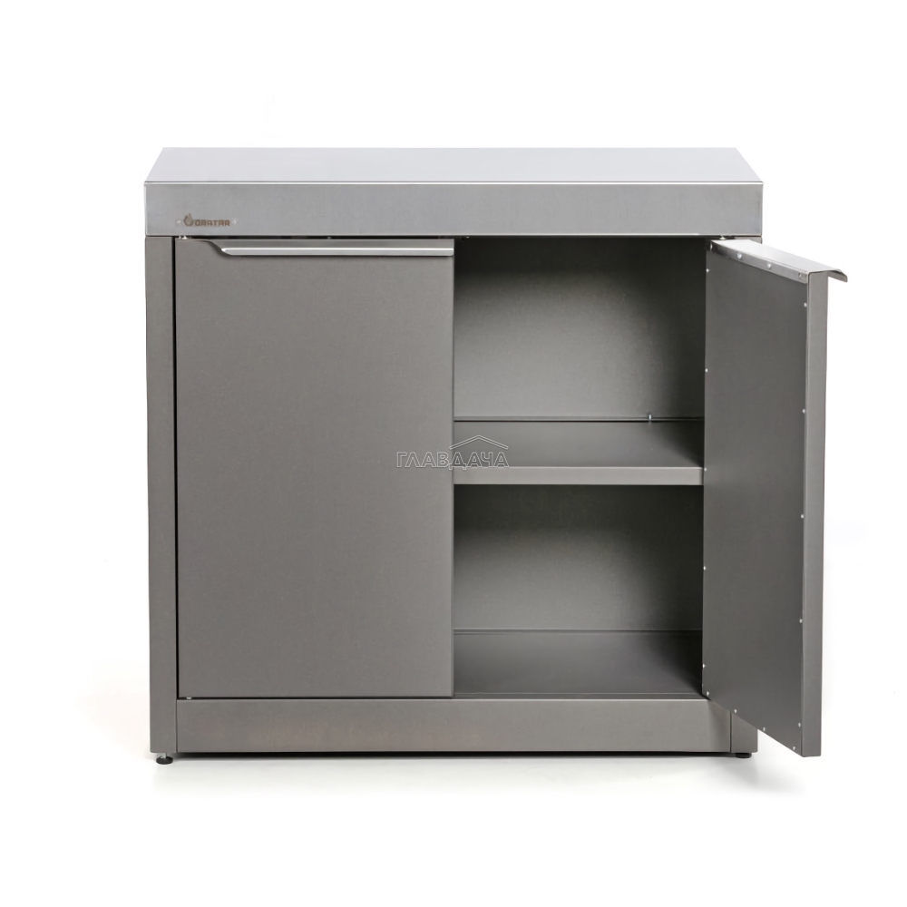 Тумба Gratar Expert — это полноценное рабочее пространство уличной кухни. Долговечная столешница из нержавеющей стали и несколько полок позволят разместить всё необходимое для приготовления блюд. Для удобства хранения габаритных аксессуаров металлическая полка имеет два положения высоты, а сама тумба оснащена дверцами.