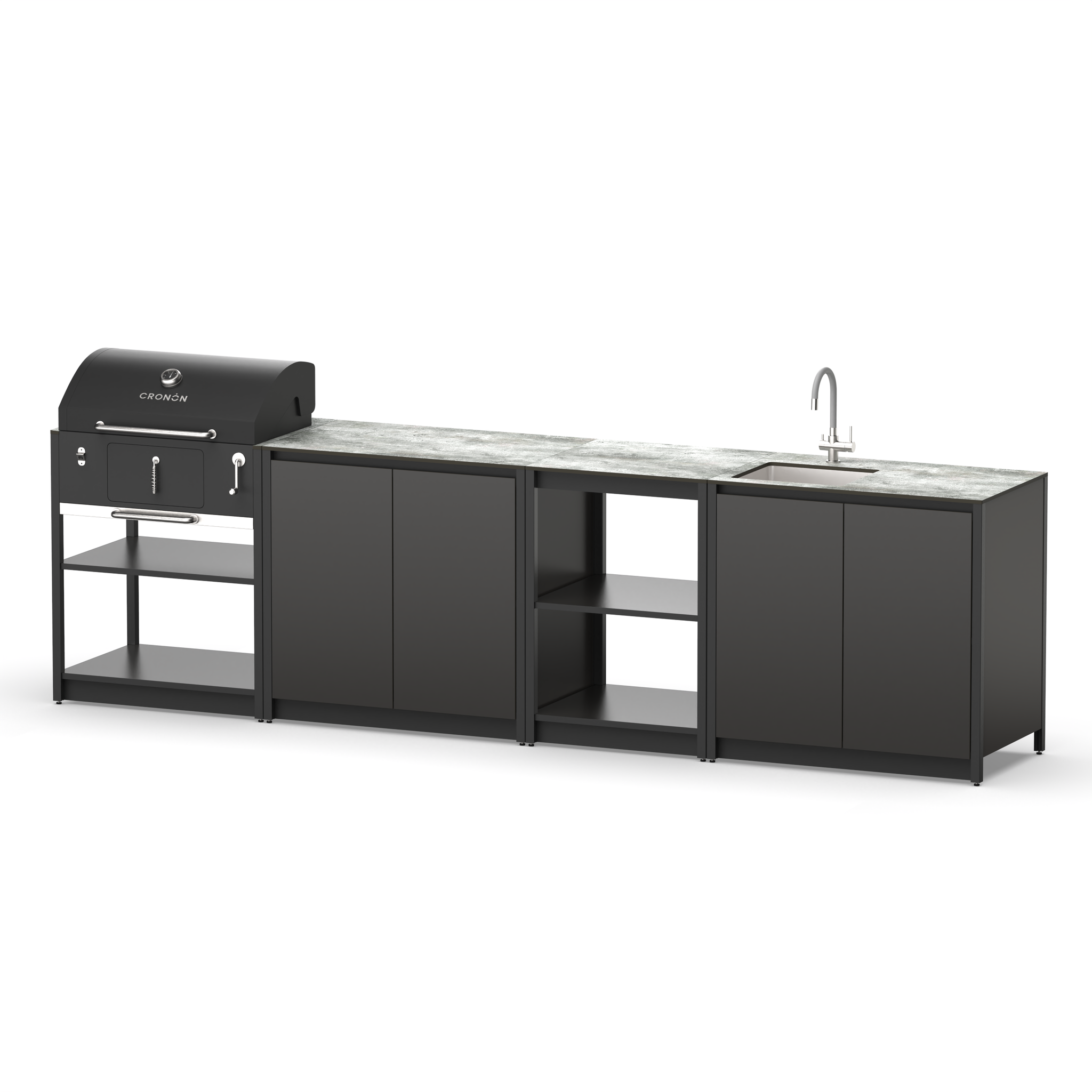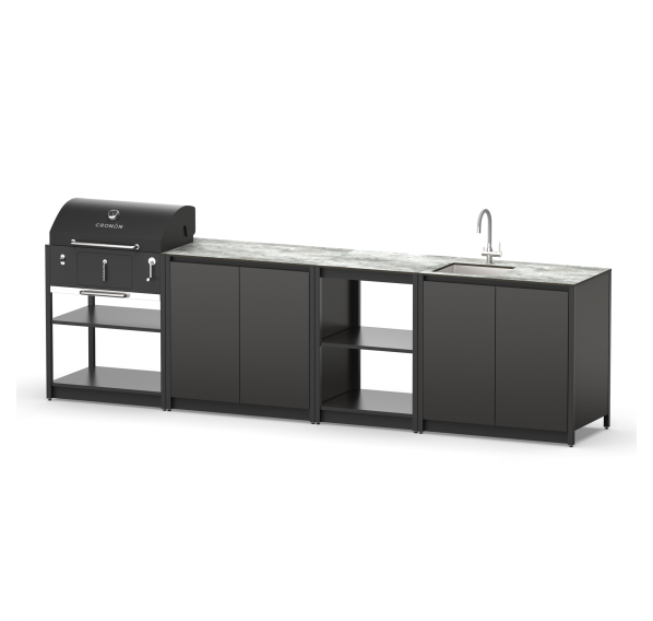 Металлическая барбекю зона из четырех модулей с мойкой, столешницей и барбекю грилем на углях.