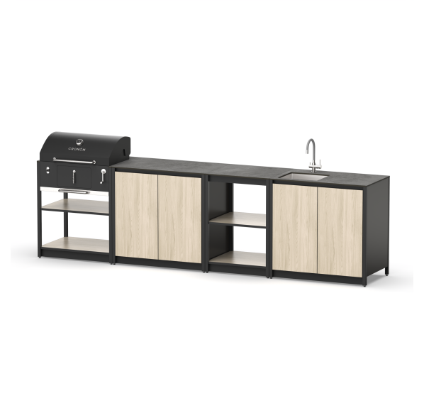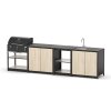 Металлическая барбекю зона из четырех модулей с мойкой, столешницей и барбекю грилем на углях.