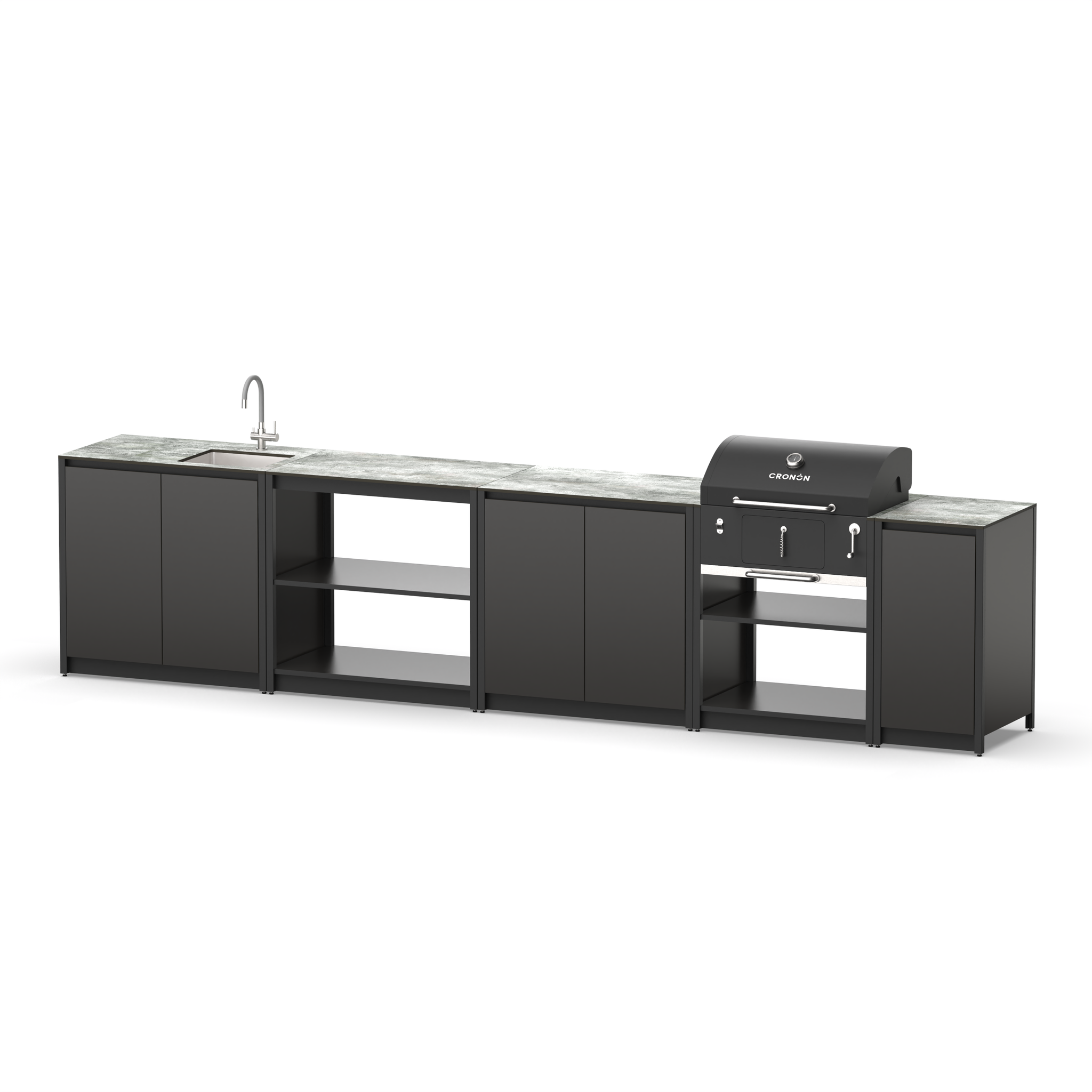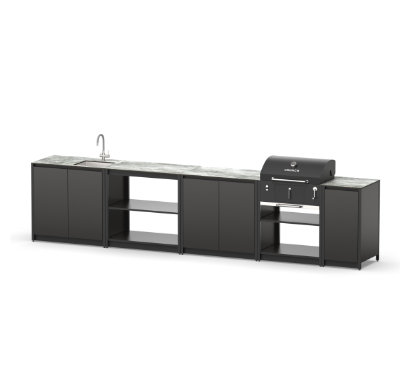 Готовый барбекю комплекс смешанного типа из пяти модулей с угольным грилем, столешницей и мойкой.