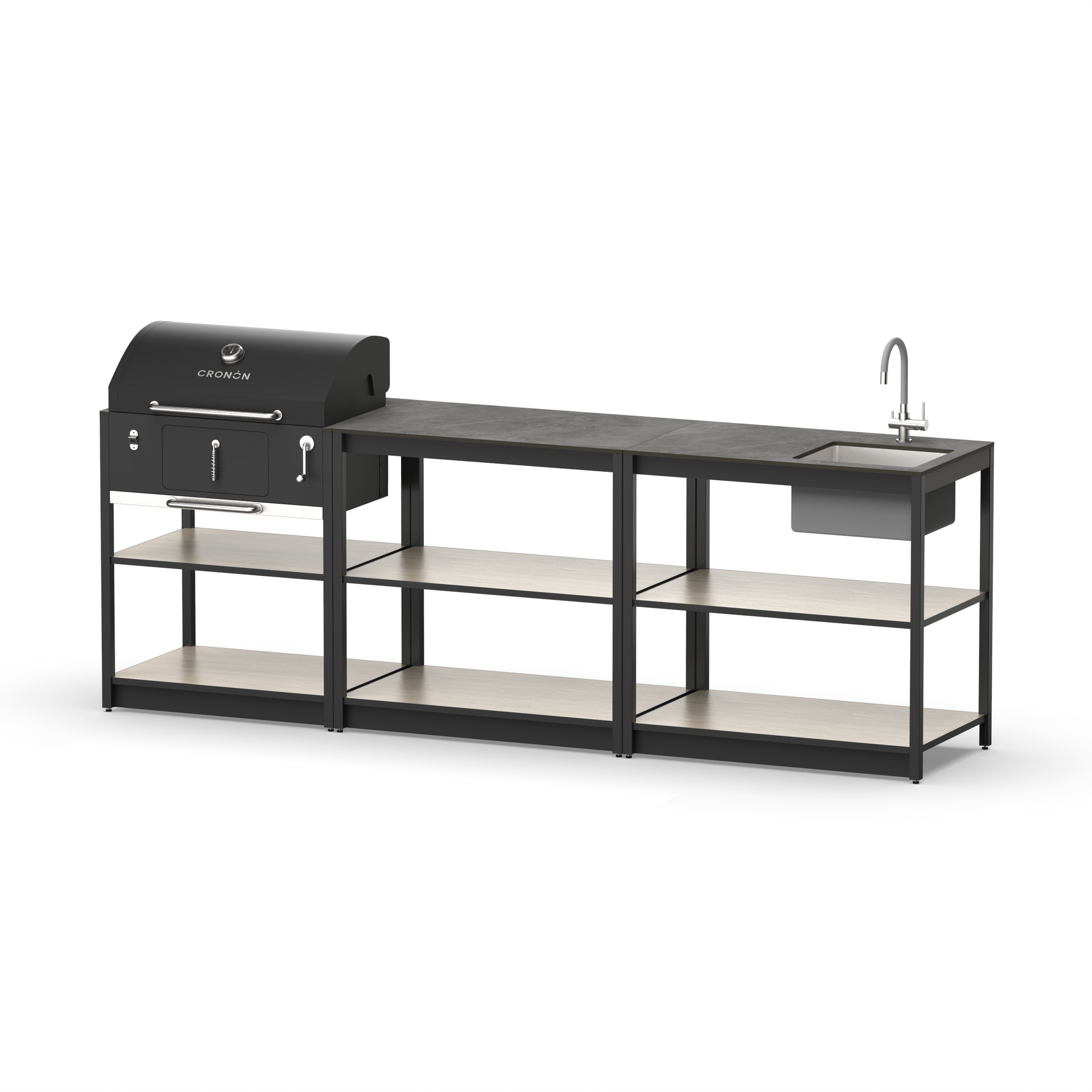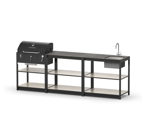 Металлический мангальный комплекс из трех модулей открытого типа с мойкой, смесителем, и грилем на углях