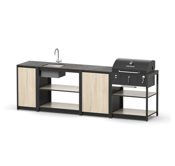 Летняя гриль кухня из четырех модулей смешанного типа с барбекю грилем, мойкой, столешницей и дверцами для улицы и дачи.
