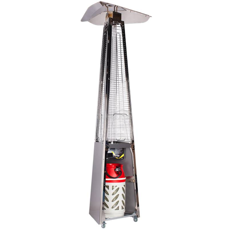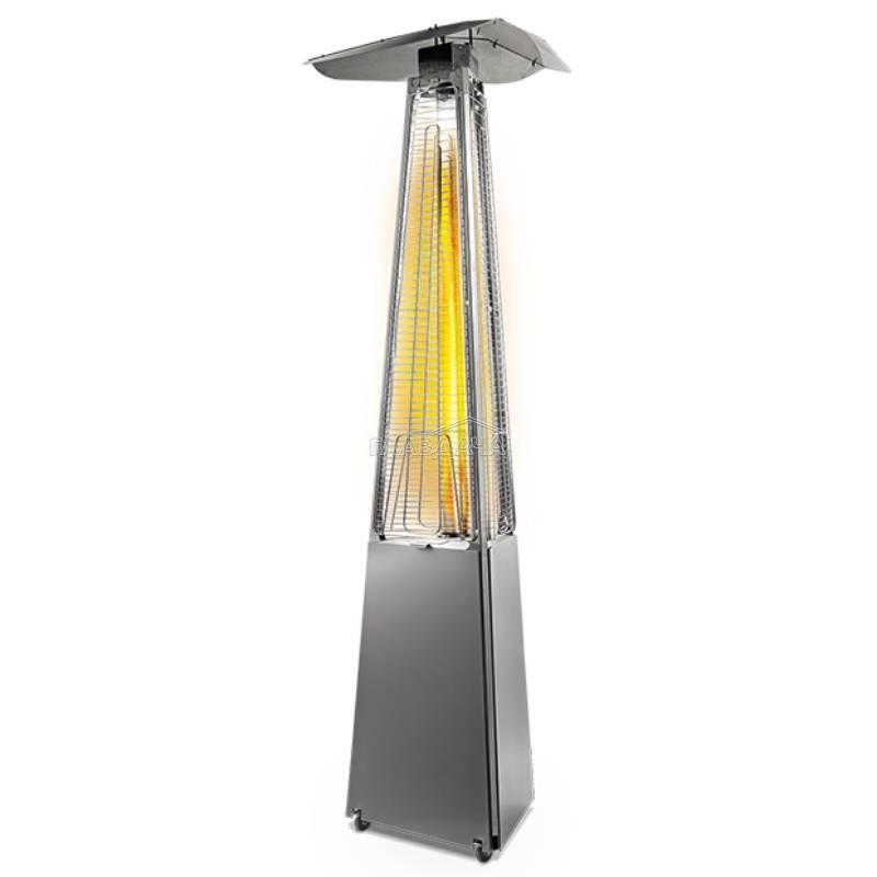 Уличный камин изготовлен из устойчивой к коррозии легированной нержавеющей стали и защищён от попадания атмосферных осадков сверху четырёхгранным отражателем, площадь поверхности которого составляет 0,5 м². За безопасность эксплуатации отвечает многоуровневая система защиты. Датчик наклона отключает пламя при наклоне газового обогревателя более чем на 45°, термоэлектрический датчик и электромагнитный клапан сразу же останавливают подачу газа в критических ситуациях, таких как затухание пламени или утечка газа. За счёт встроенной колёсной базы обогреватель свободно и безопасно можно перемещать по любой поверхности.