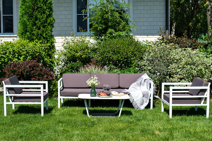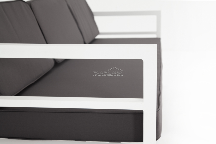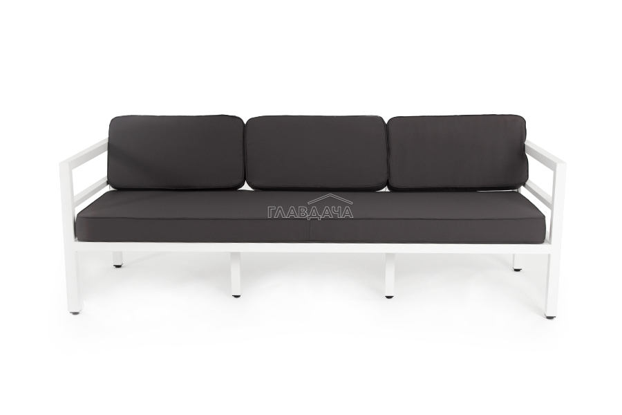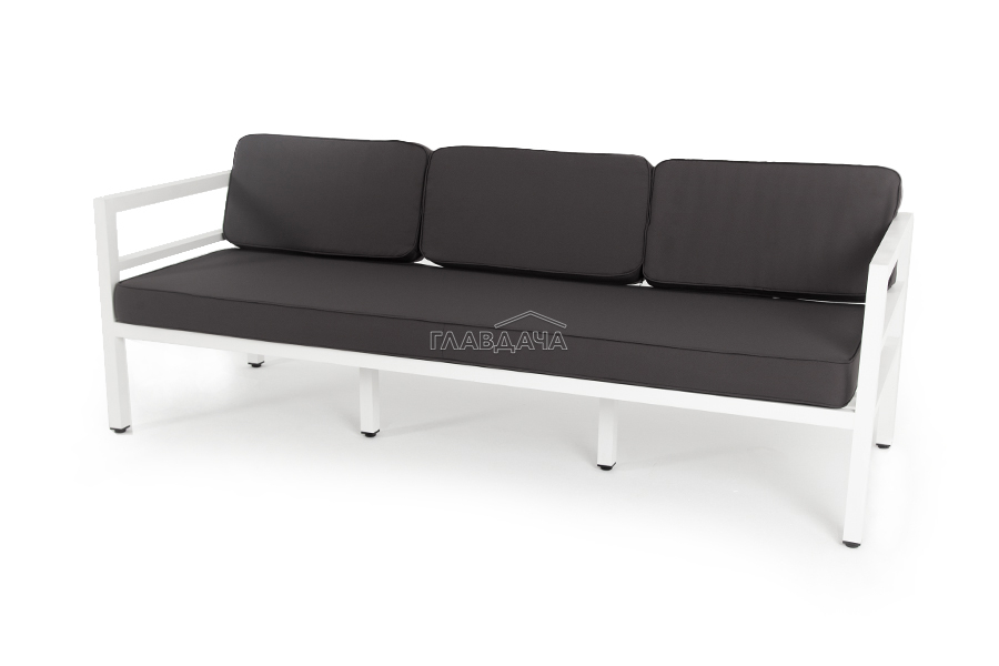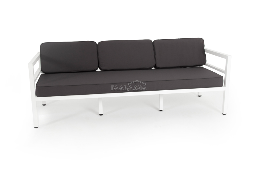Трехместный диван «Эстелья». Каркас из алюминия, окрашенный в белый цвет, мягкие подушки на сидениях и спинках со съёмными чехлами темно-серого цвета.