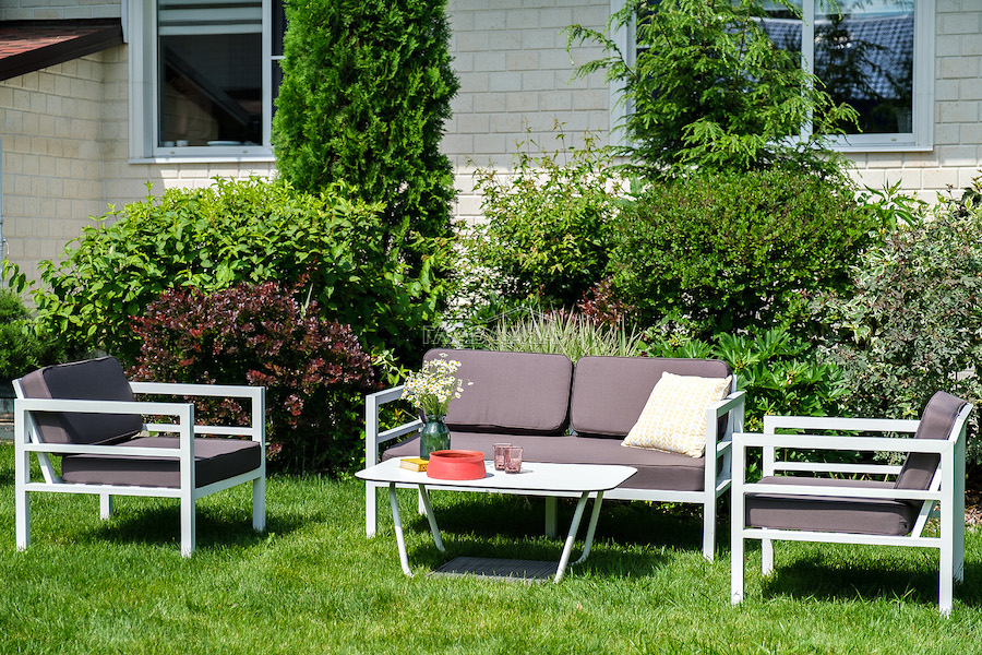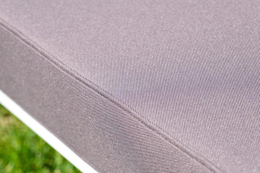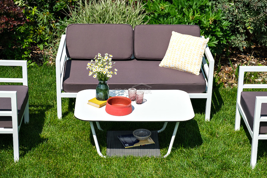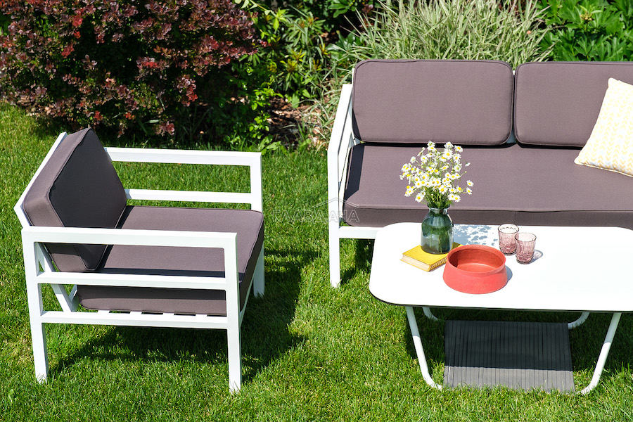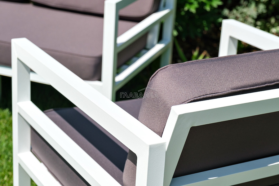 Каркас дивана и кресел выполнен из прочного алюминия и окрашен в белый цвет. Комплект дополняют подушки со съёмными чехлами и водоотталкивающей пропиткой. Материал чехлов - 100% полиэстер плотностью 300гр/м2.