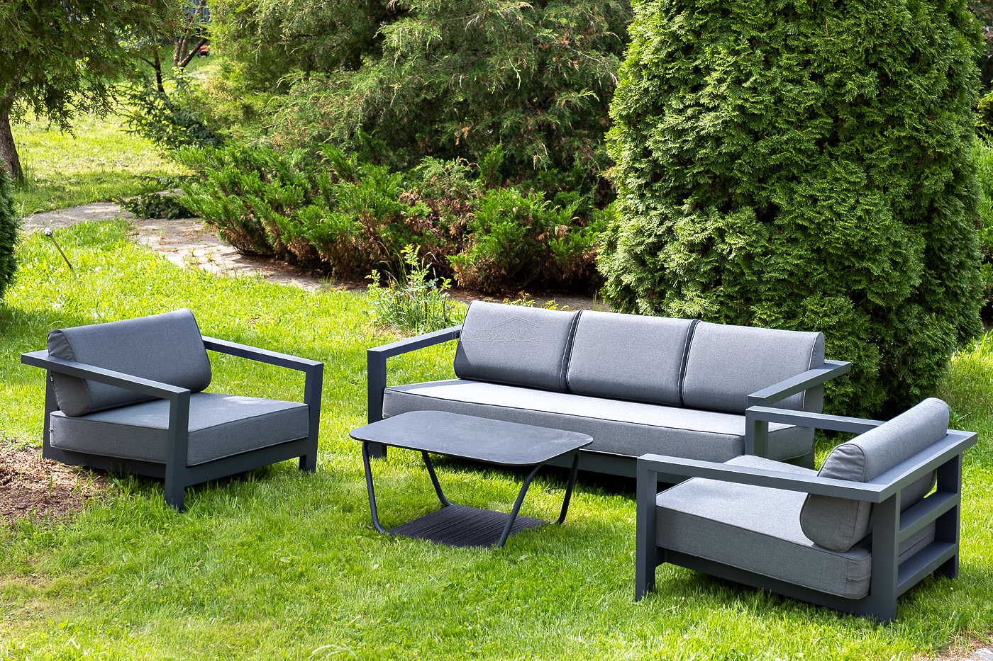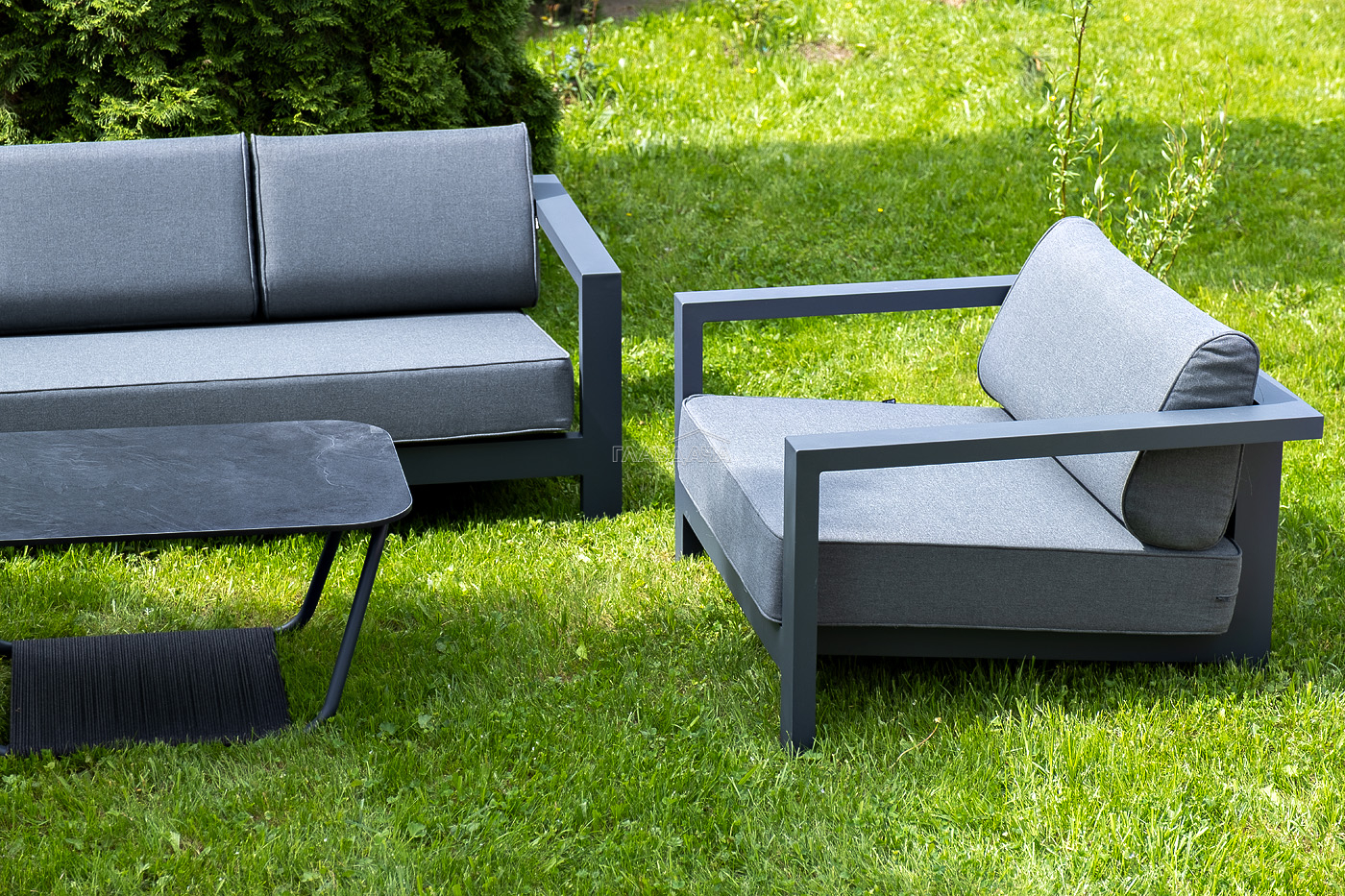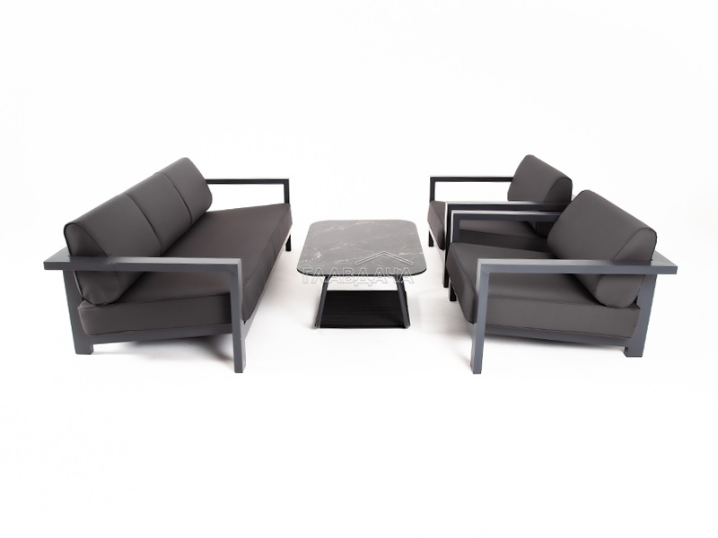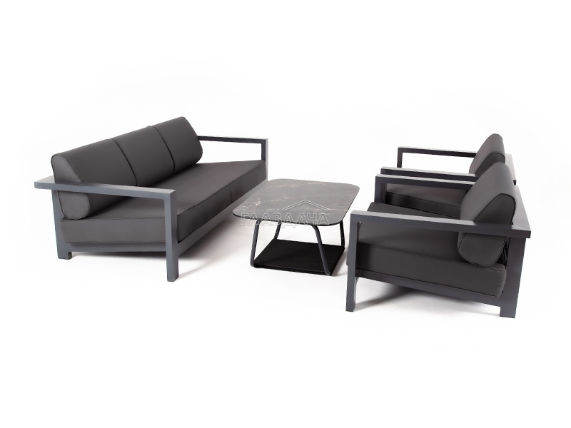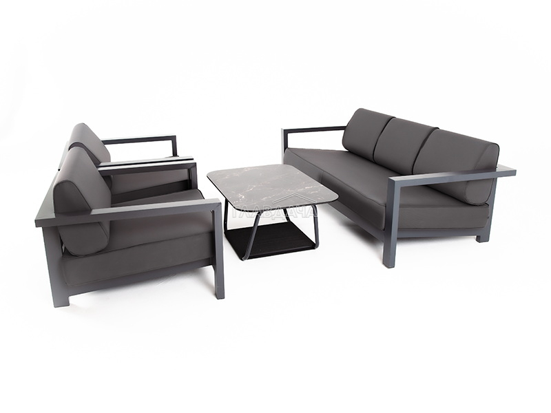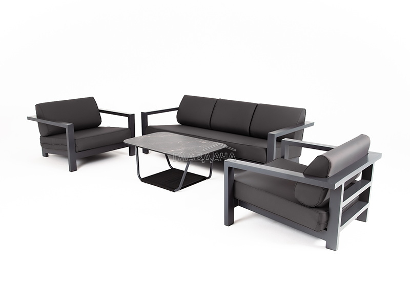 Каркас мебели выполнен из алюминиевого профиля, окрашенного в темно-серый (RAL7024) цвет. Дополняют комплект подушки со съёмными чехлами.