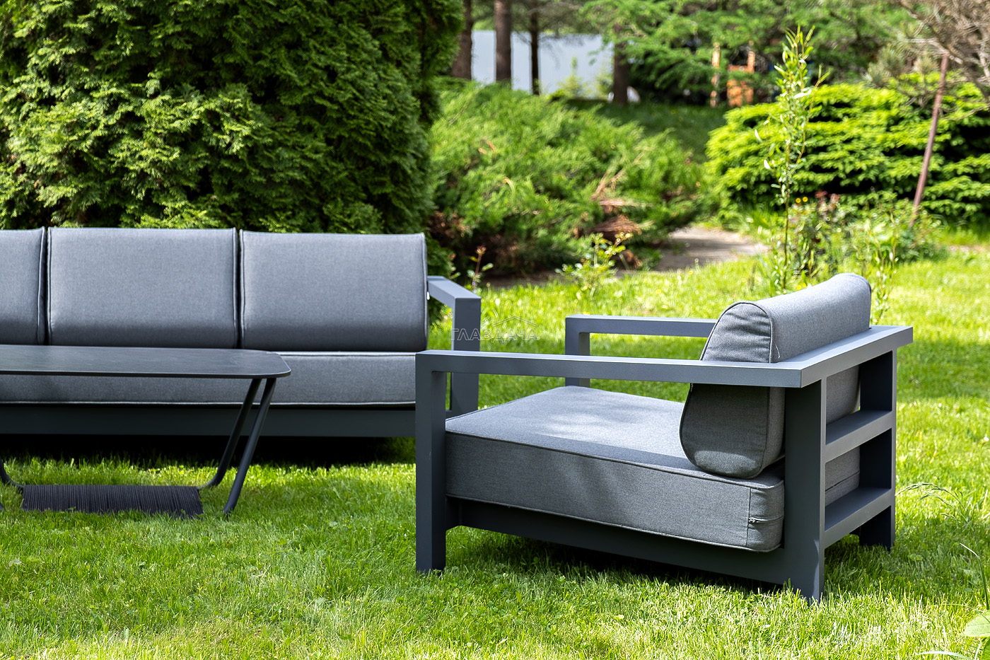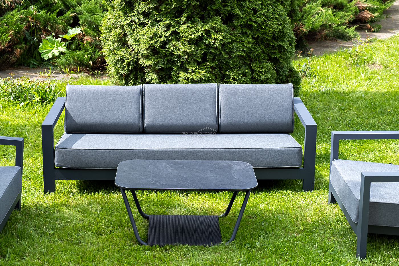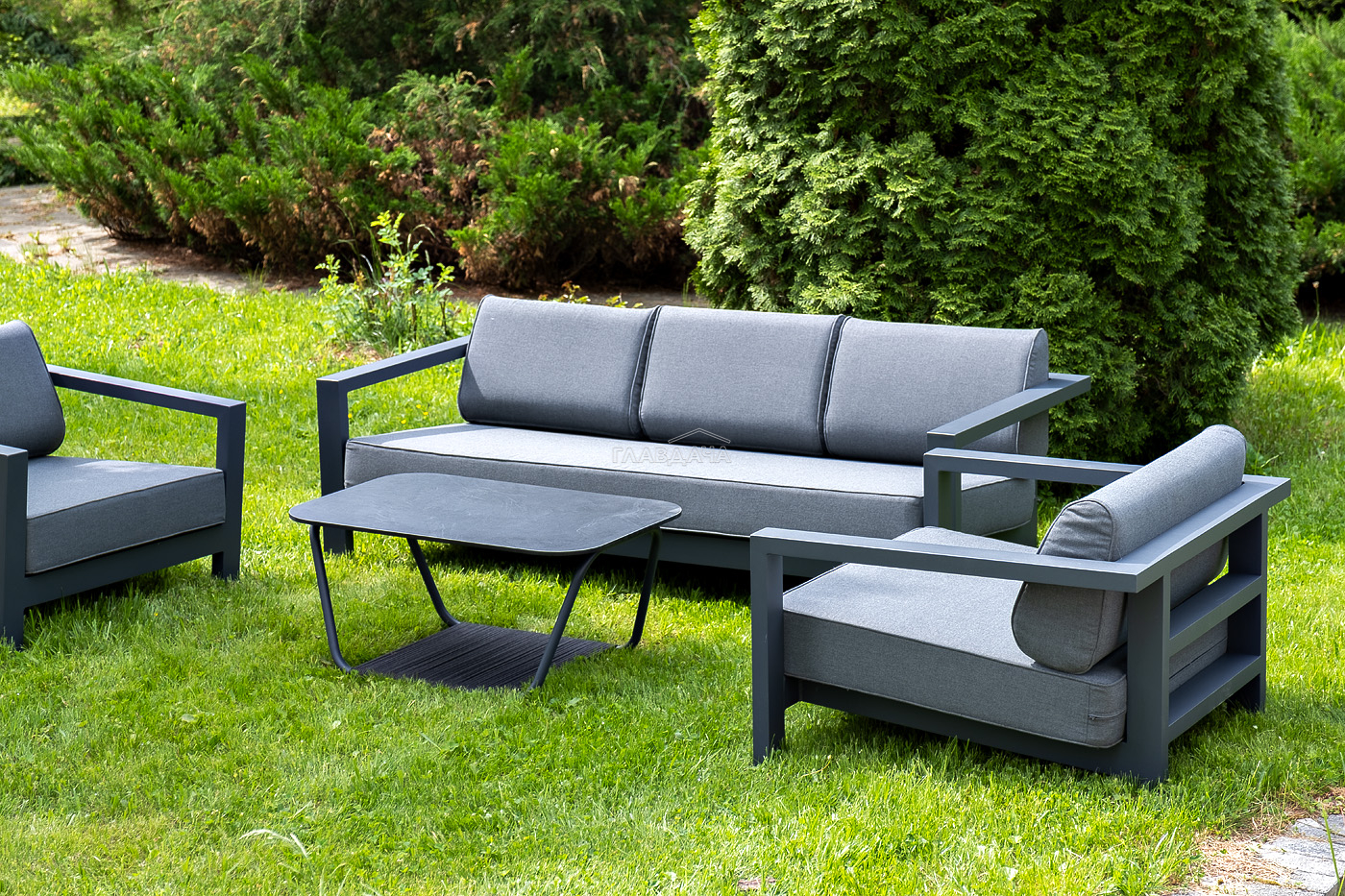 Каркас мебели выполнен из алюминиевого профиля, окрашенного в темно-серый (RAL7024) цвет. Дополняют комплект подушки со съёмными чехлами.