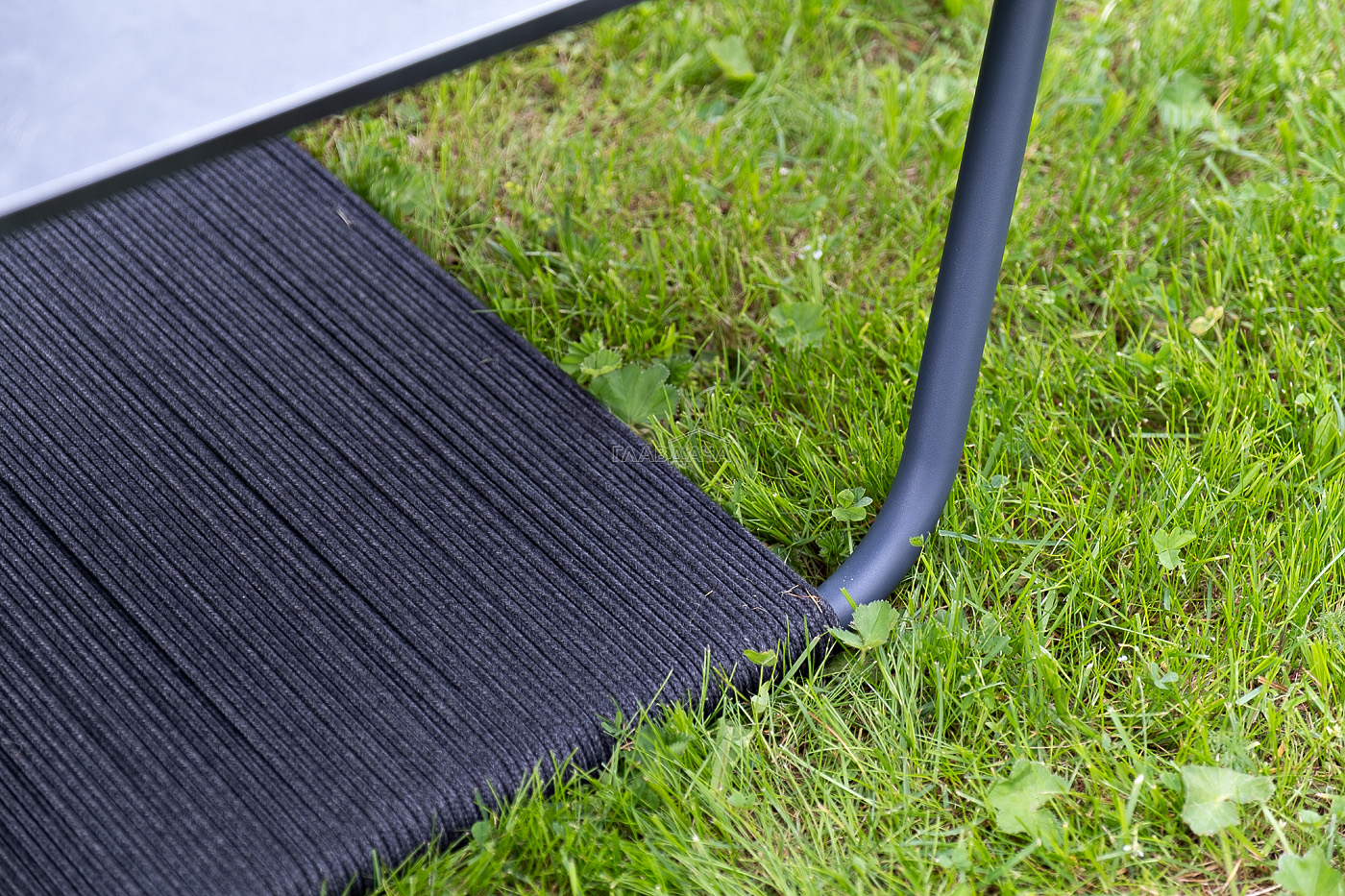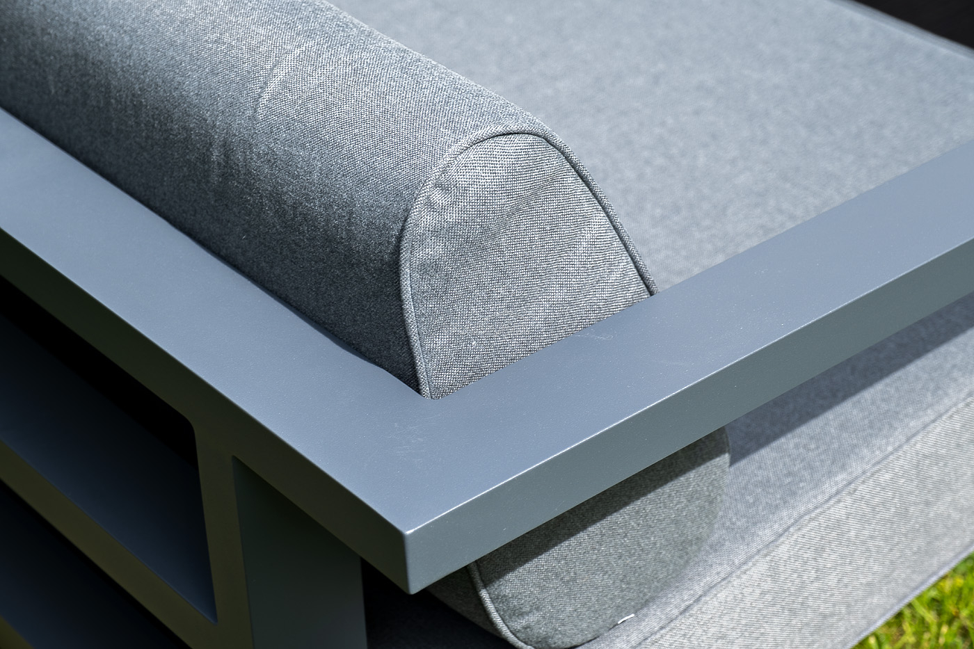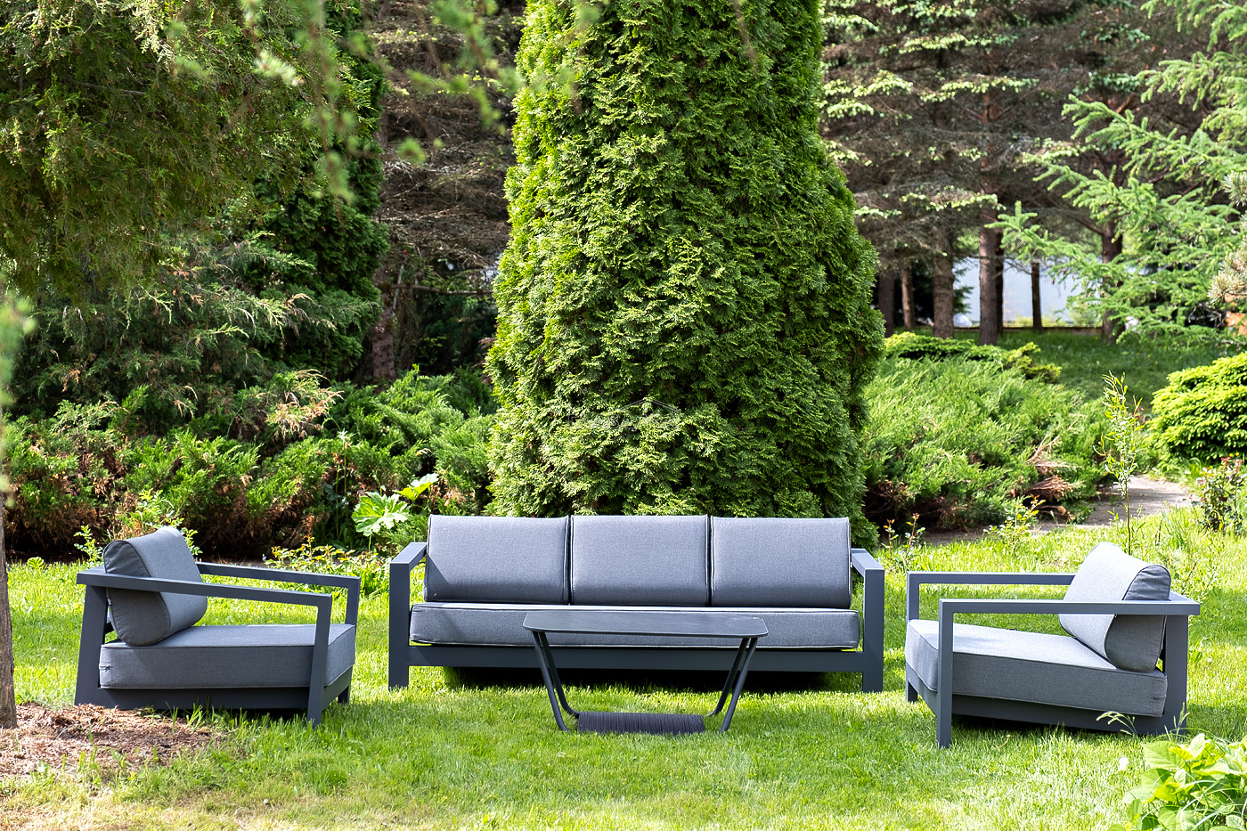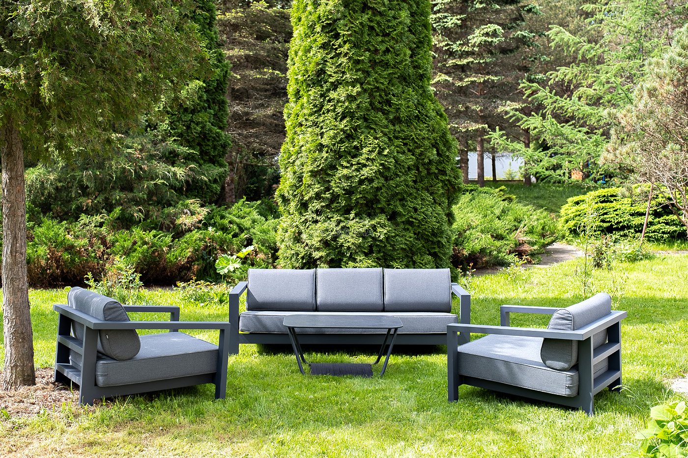 Каркас мебели выполнен из алюминиевого профиля, окрашенного в темно-серый (RAL7024) цвет. Дополняют комплект подушки со съёмными чехлами.